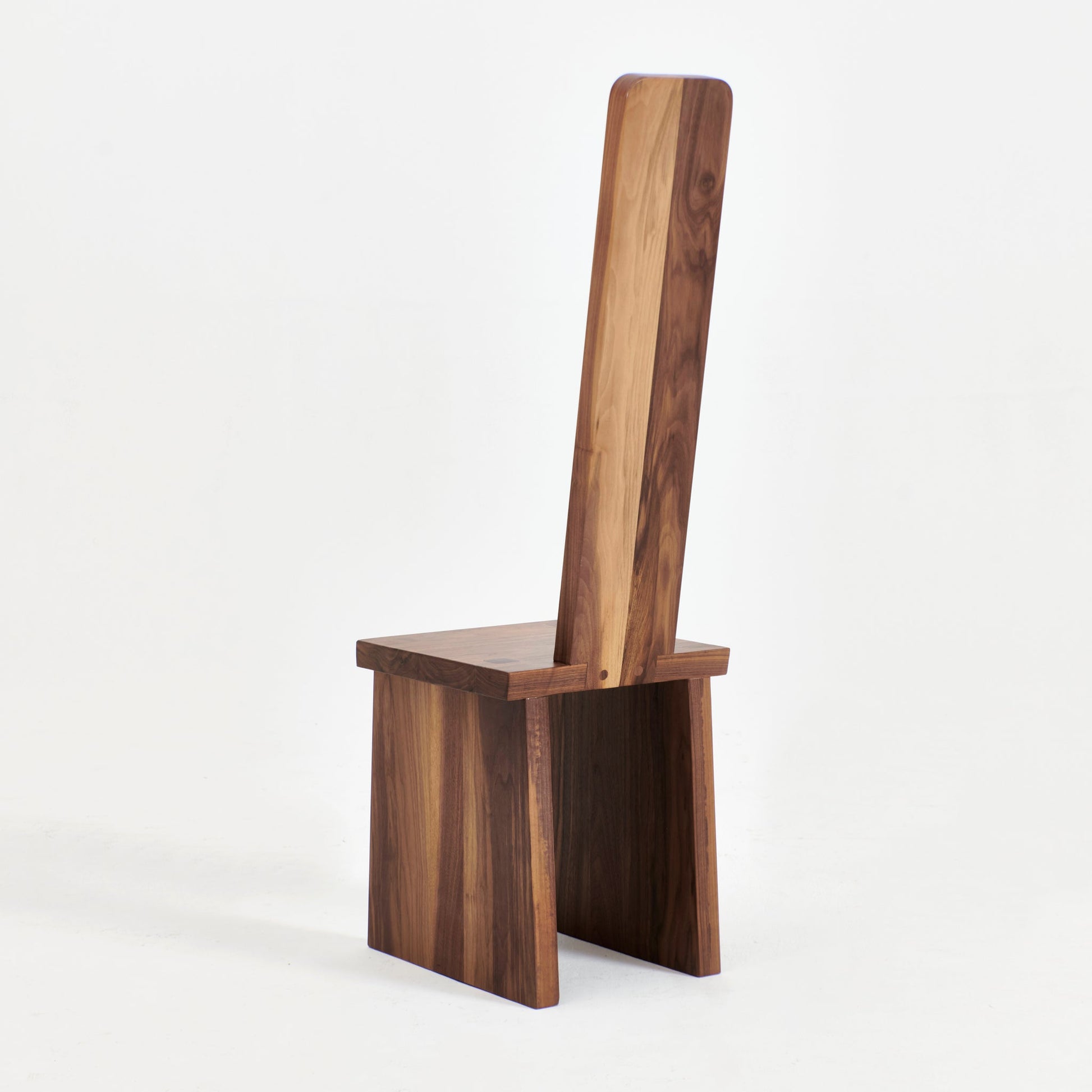 This chair is part of a series with eight different designs with a graphic shaped back rest and structural legs. Hand carved in solid walnut by skilled artisans in Northern Portugal.