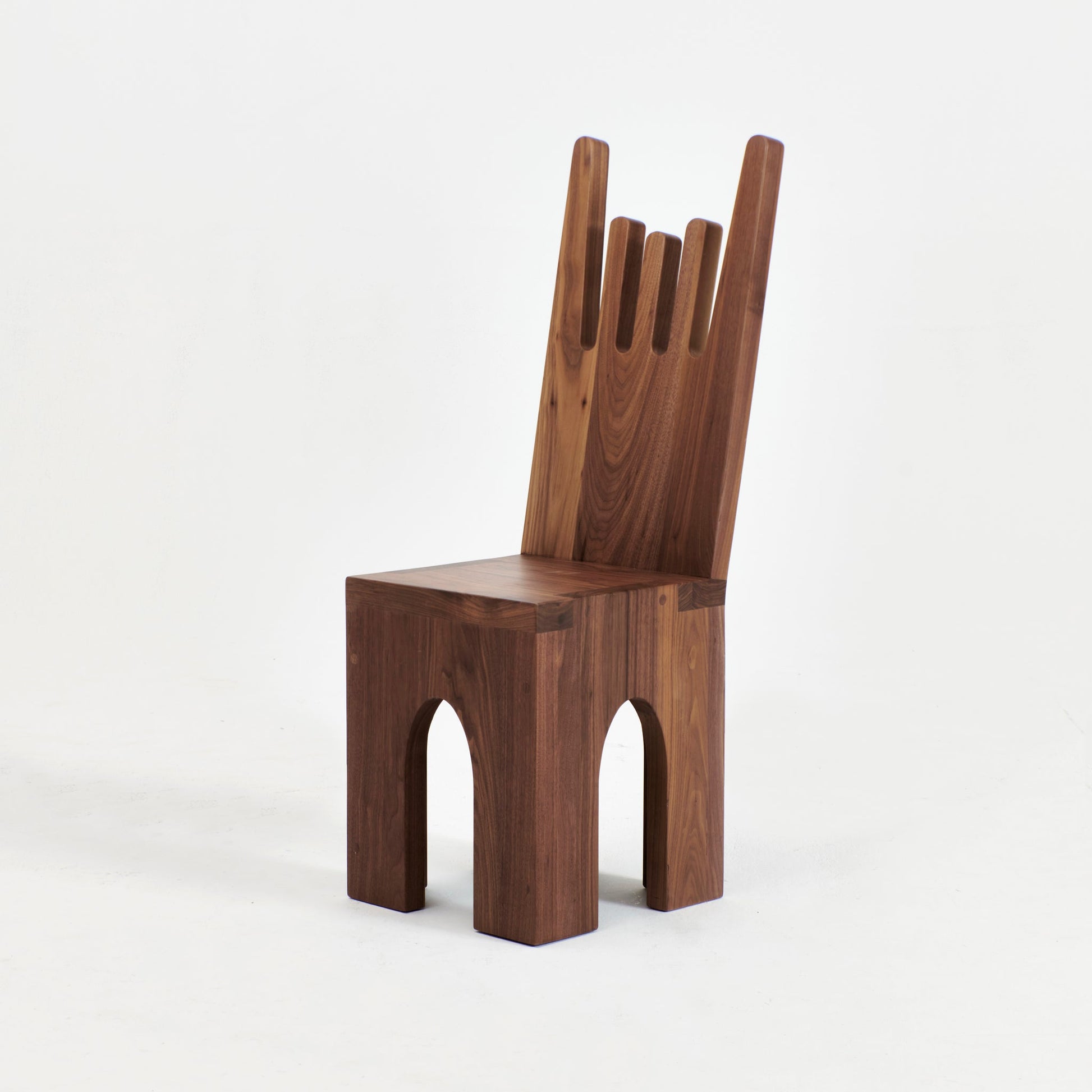 This chair is part of a series with eight different designs with a graphic-shaped back rest and structural legs. Hand carved in solid walnut by skilled artisans in Northern Portugal.