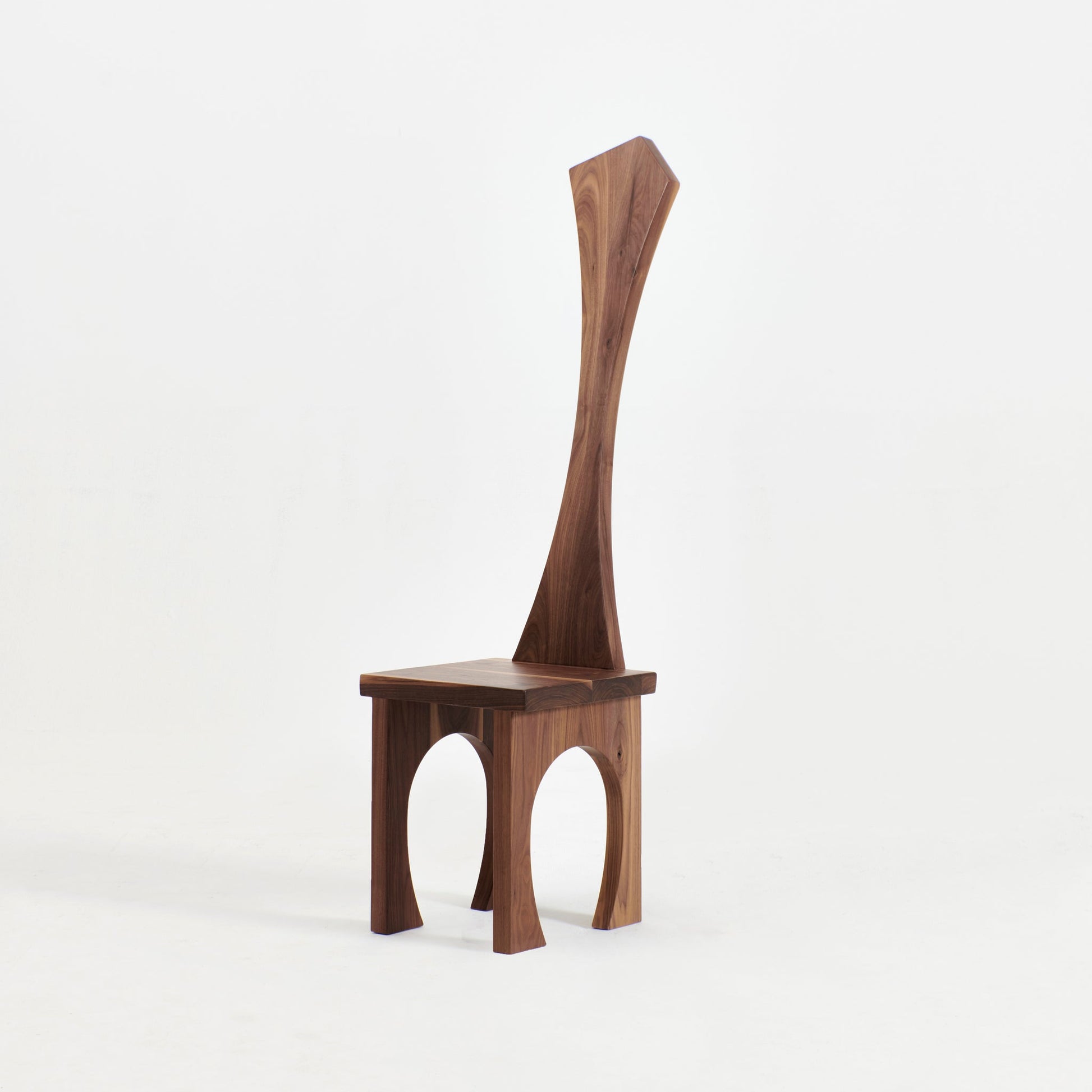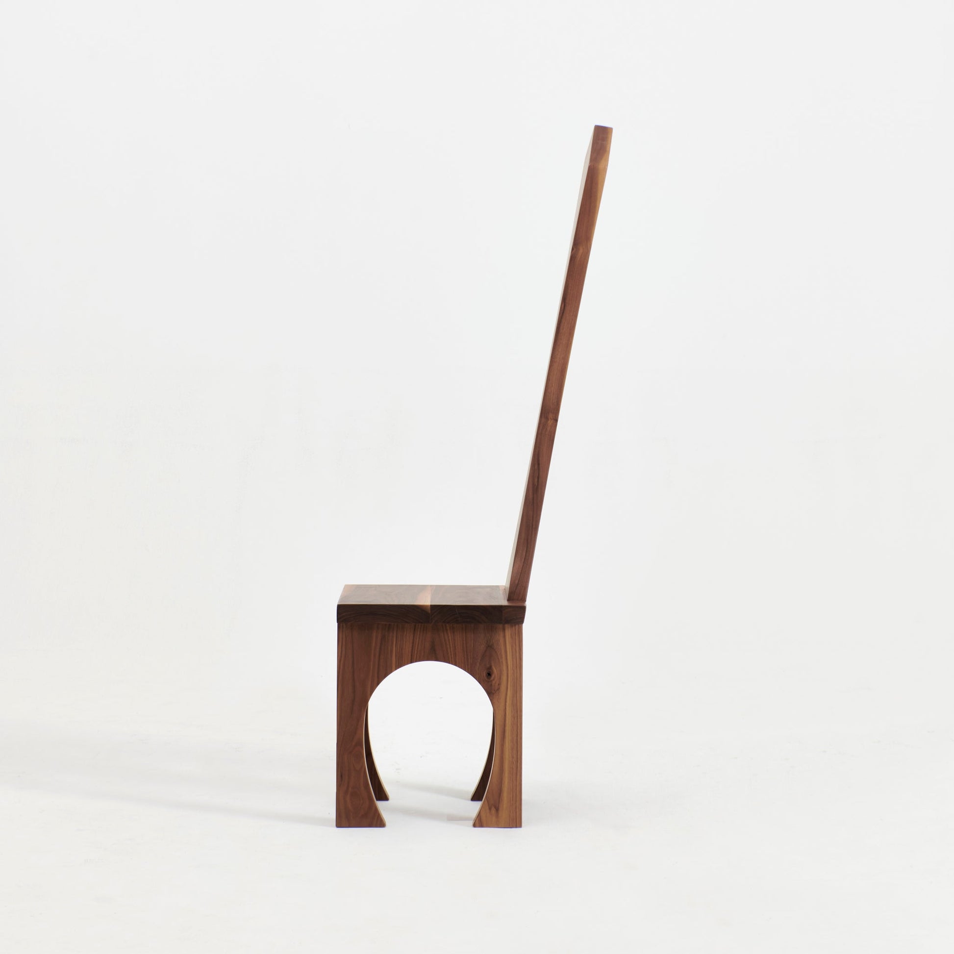 This chair is part of a series with eight different designs with a graphic-shaped back rest and structural legs. Hand carved in solid walnut by skilled artisans in Northern Portugal.
