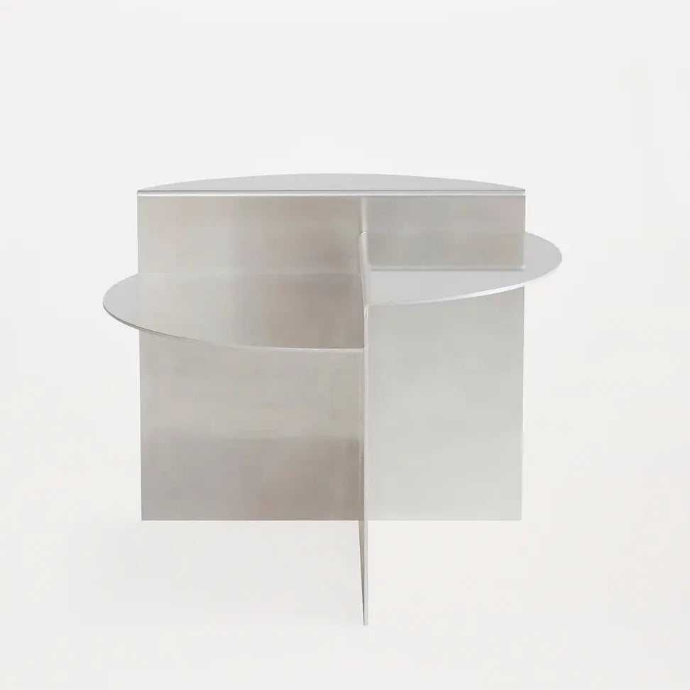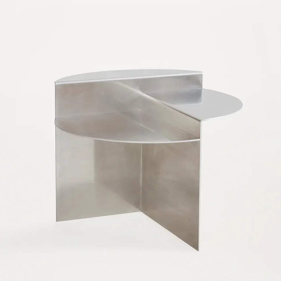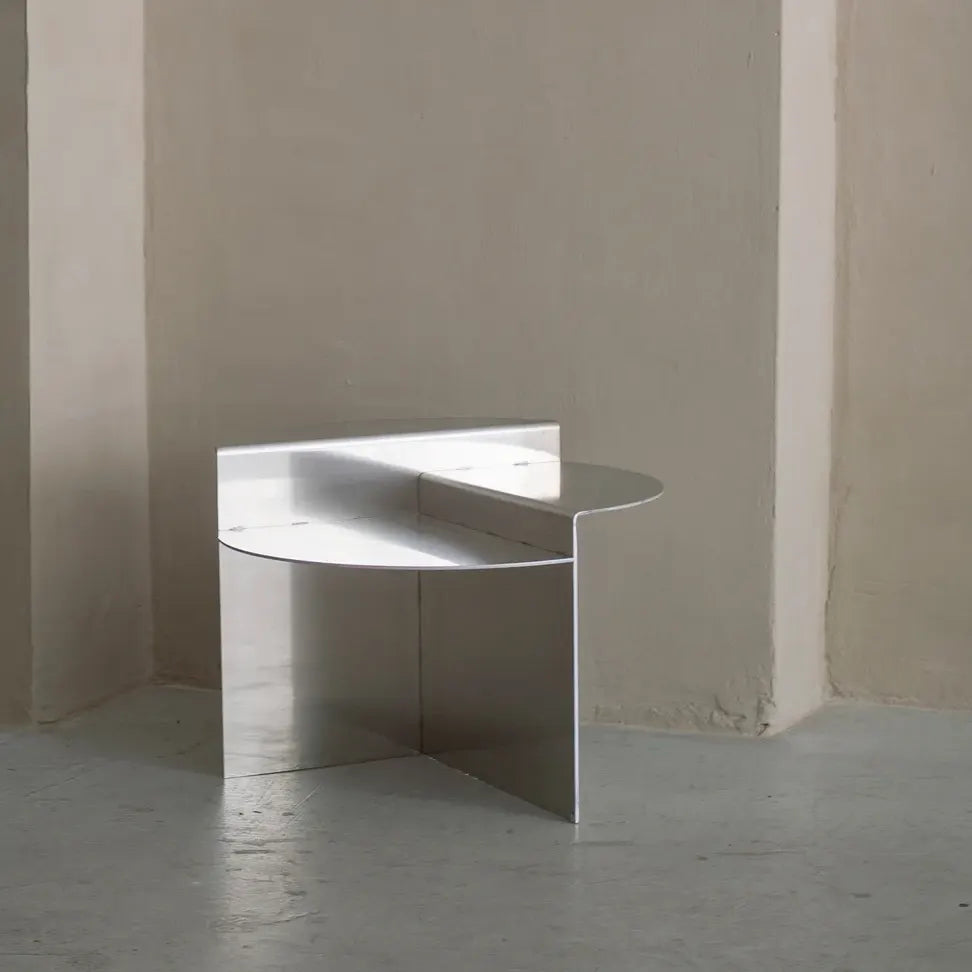The Rivet Side Table is a versatile furniture piece suitable for any room. Its circular top is divided into three different levels, creating a dynamic surface. Based on a riveting technique suitable for making perpendicular joints between separate, laser-cut raw aluminum sheets, the chair is put together by hand using a hammer in a cold-forming assembly process developed by designer Jonas Trampedach in 2011.