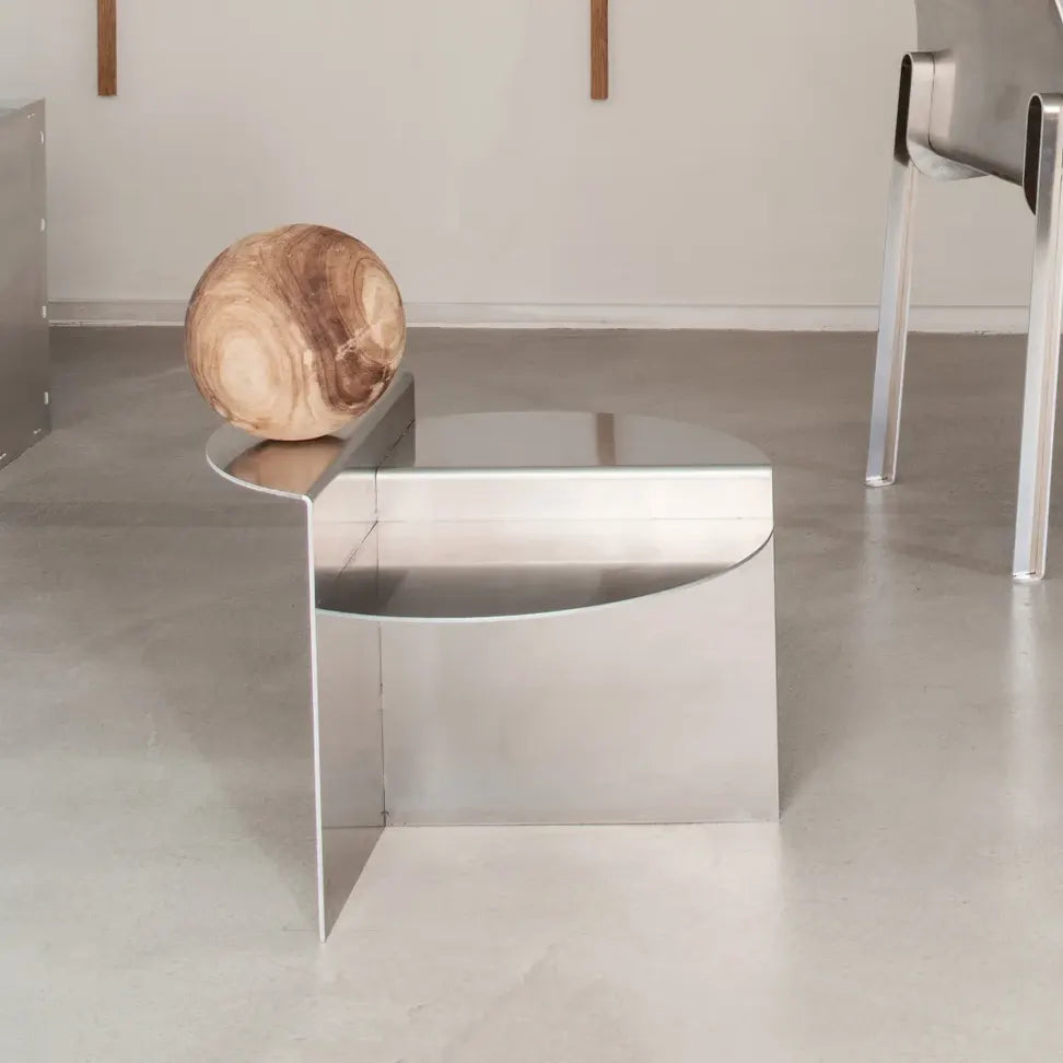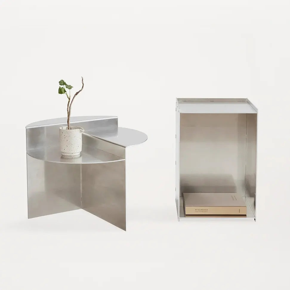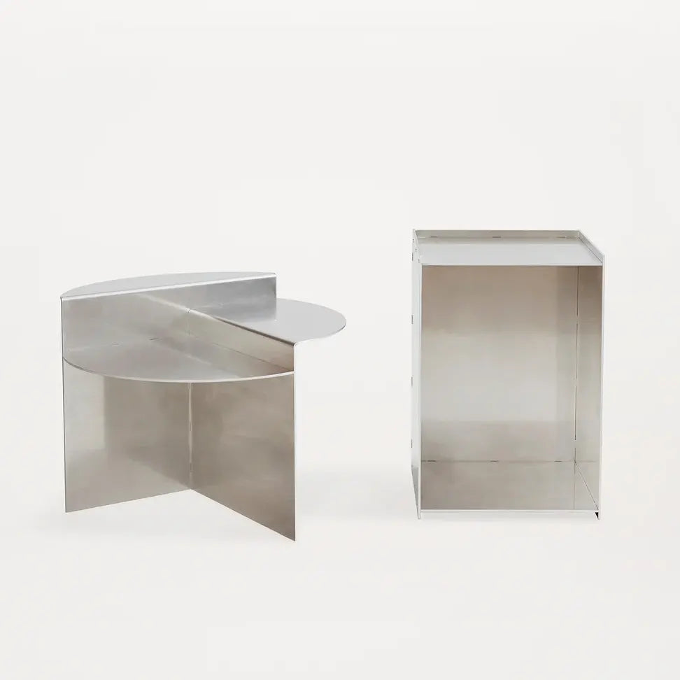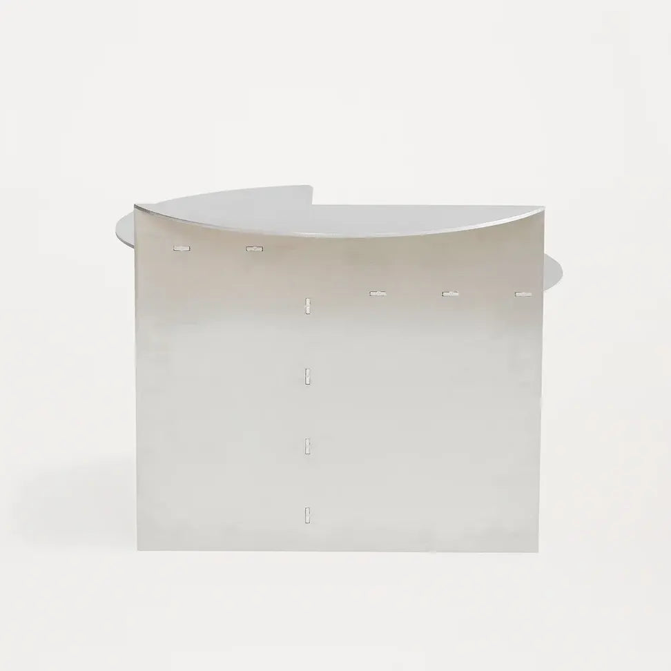 The Rivet Side Table is a versatile furniture piece suitable for any room. Its circular top is divided into three different levels, creating a dynamic surface. Based on a riveting technique suitable for making perpendicular joints between separate, laser-cut raw aluminum sheets, the chair is put together by hand using a hammer in a cold-forming assembly process developed by designer Jonas Trampedach in 2011.