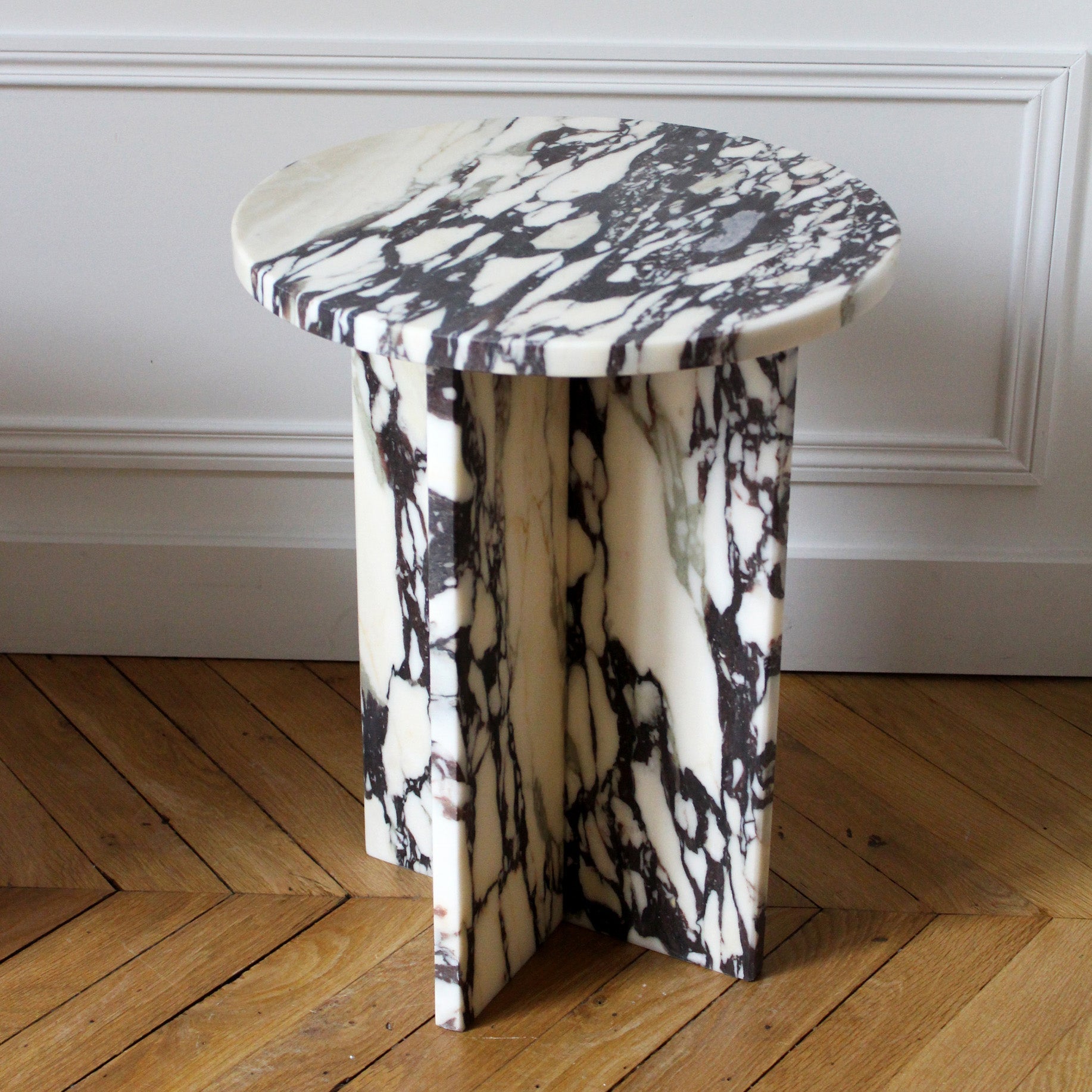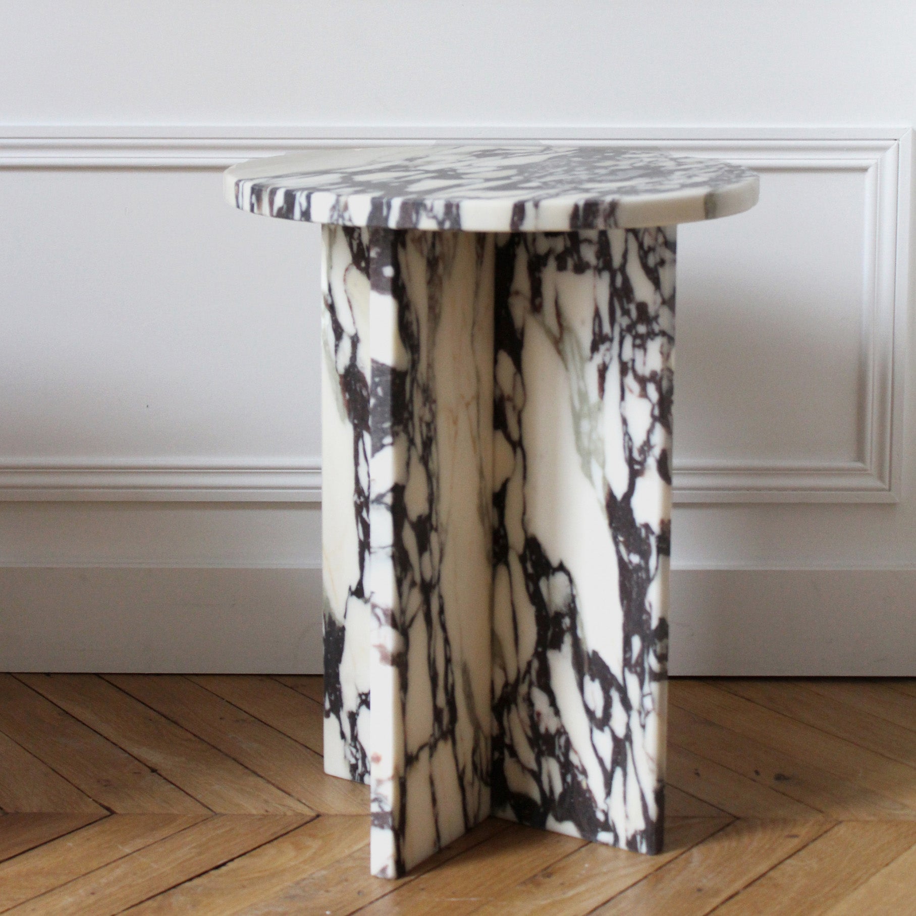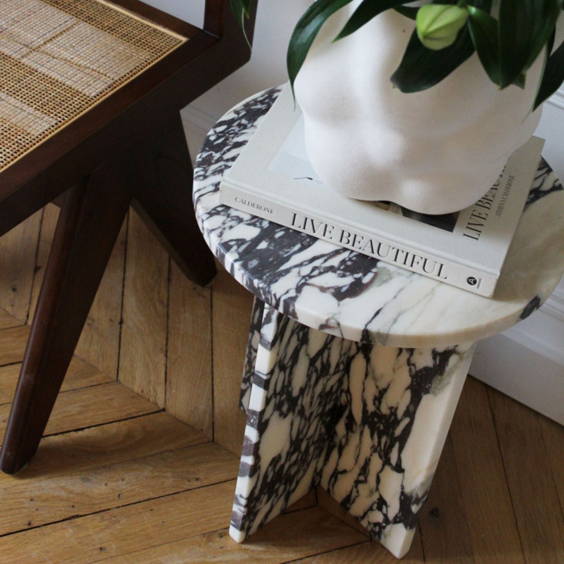 The Rosie table is defined by its minimalist and purified design. The round top brings softness, while its cross legs give a modern side. This piece can be used as a side table or bedside table. We love this light and timeless design that will bring originality and softness to your interior.
