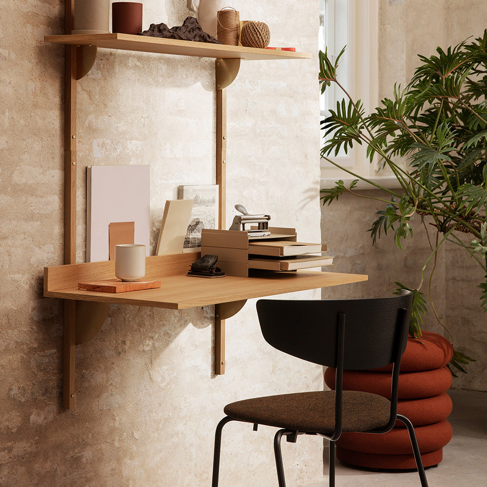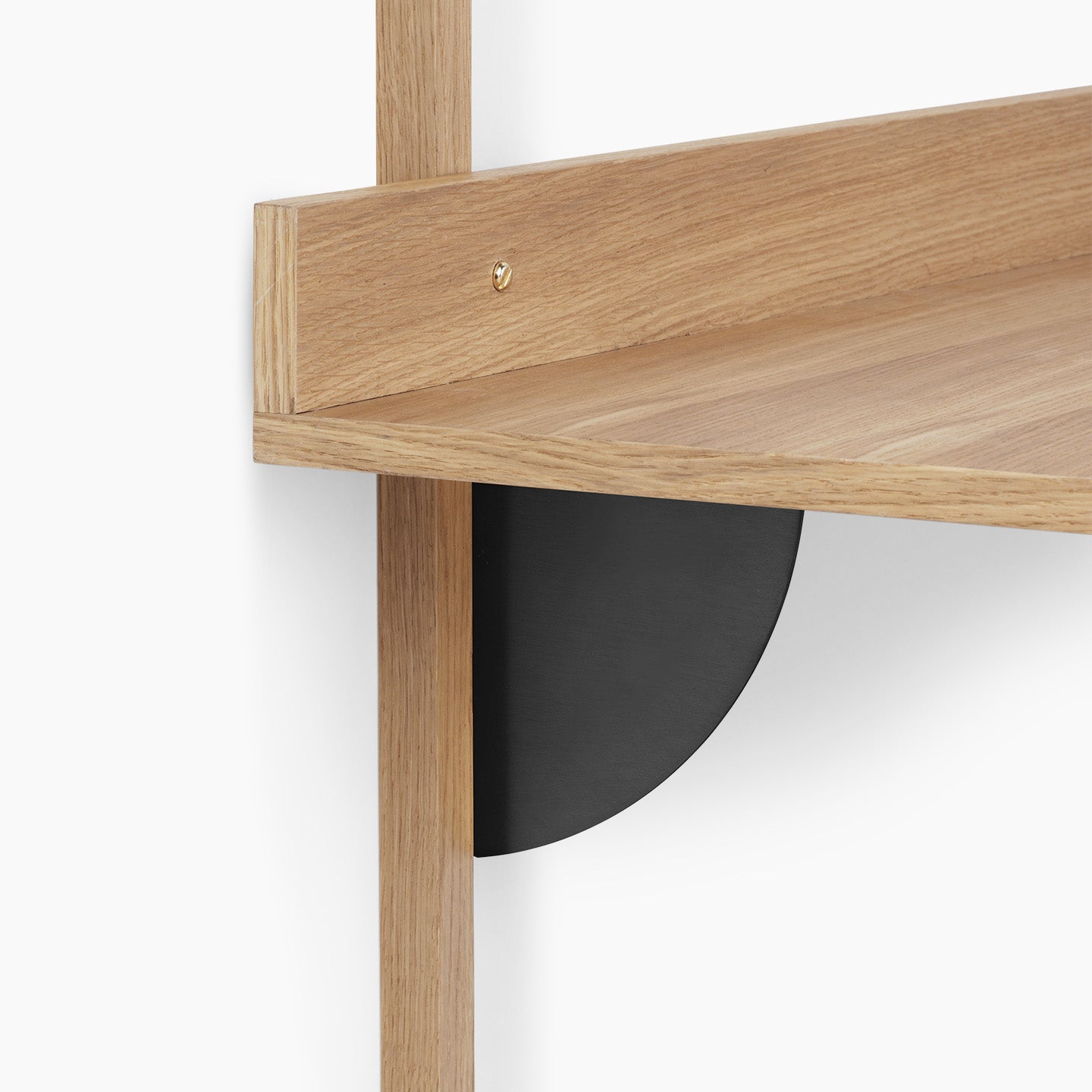 A new and modern take on Mid-century shelving units, Sector is defined by its sturdy simplicity and classic combination of wood and brass. Use the Sector Desk as a standalone surface or combine it with the Sector Shelves of your choice to form one integrated and cohesive workspace. A short border at the end of the desk forms a small, narrow space that’s ideal for propping up hand-written notes or a favourite photograph. Choose between natural oak veneer or black stained ash veneer with brackets of either polished or blackened brass.