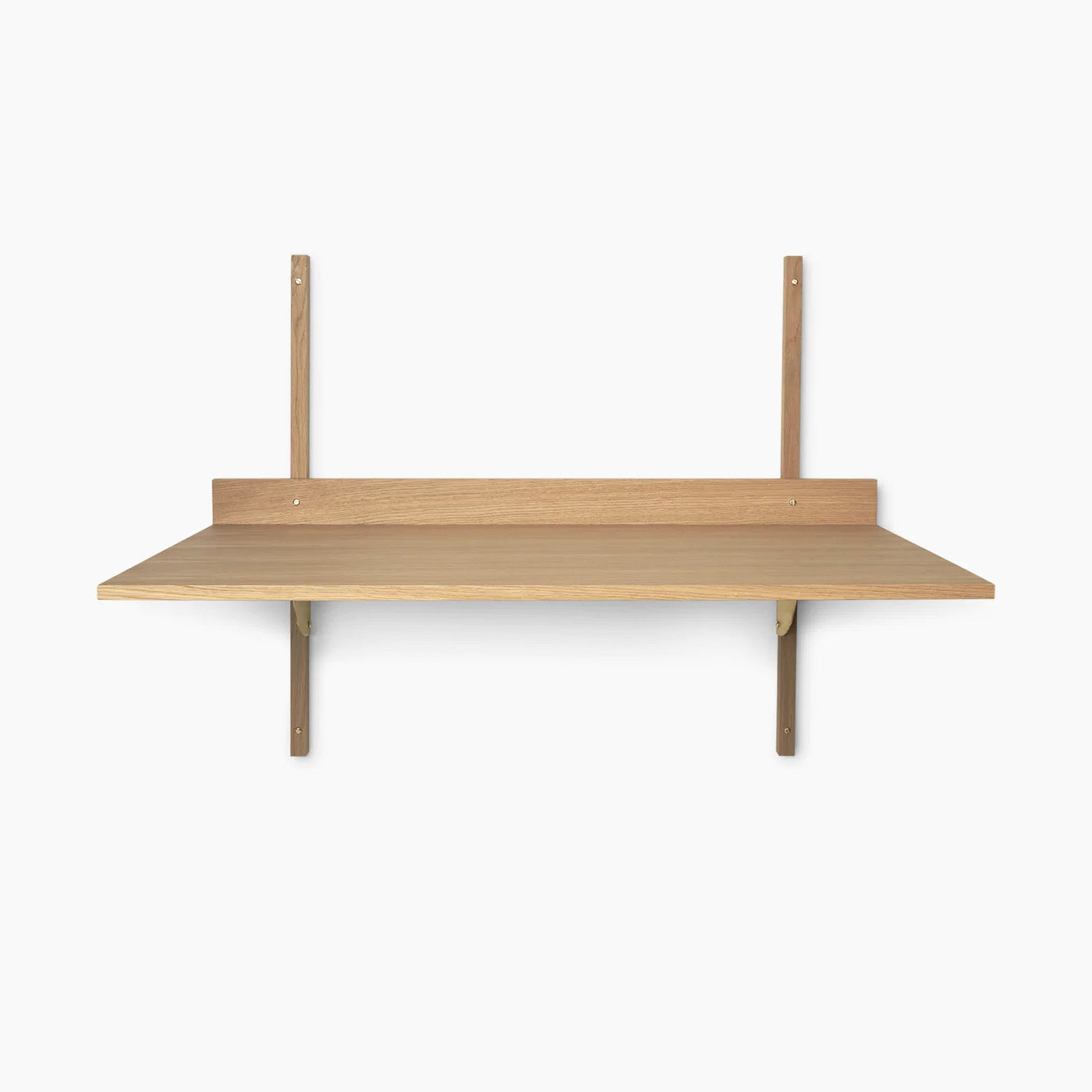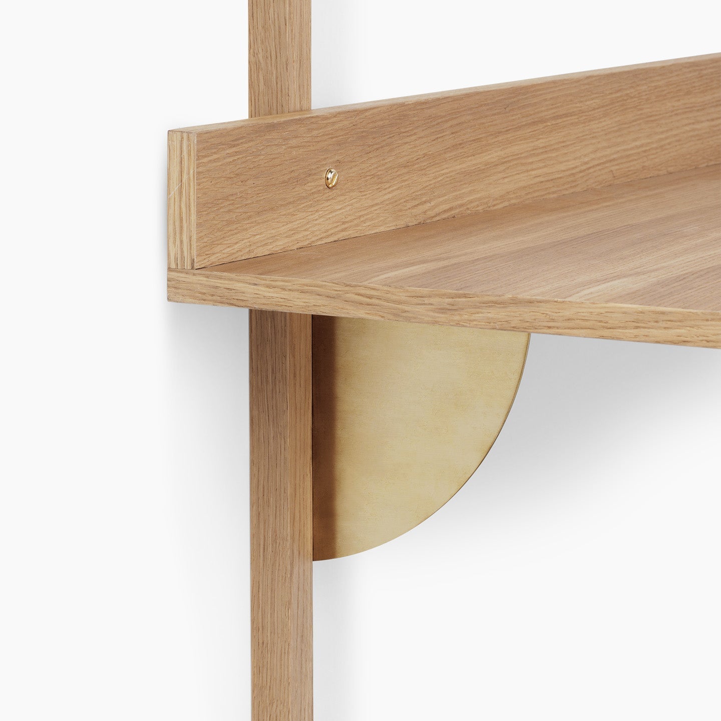 A new and modern take on Mid-century shelving units, Sector is defined by its sturdy simplicity and classic combination of wood and brass. Use the Sector Desk as a standalone surface or combine it with the Sector Shelves of your choice to form one integrated and cohesive workspace. A short border at the end of the desk forms a small, narrow space that’s ideal for propping up hand-written notes or a favourite photograph. Choose between natural oak veneer or black stained ash veneer with brackets of either polished or blackened brass.