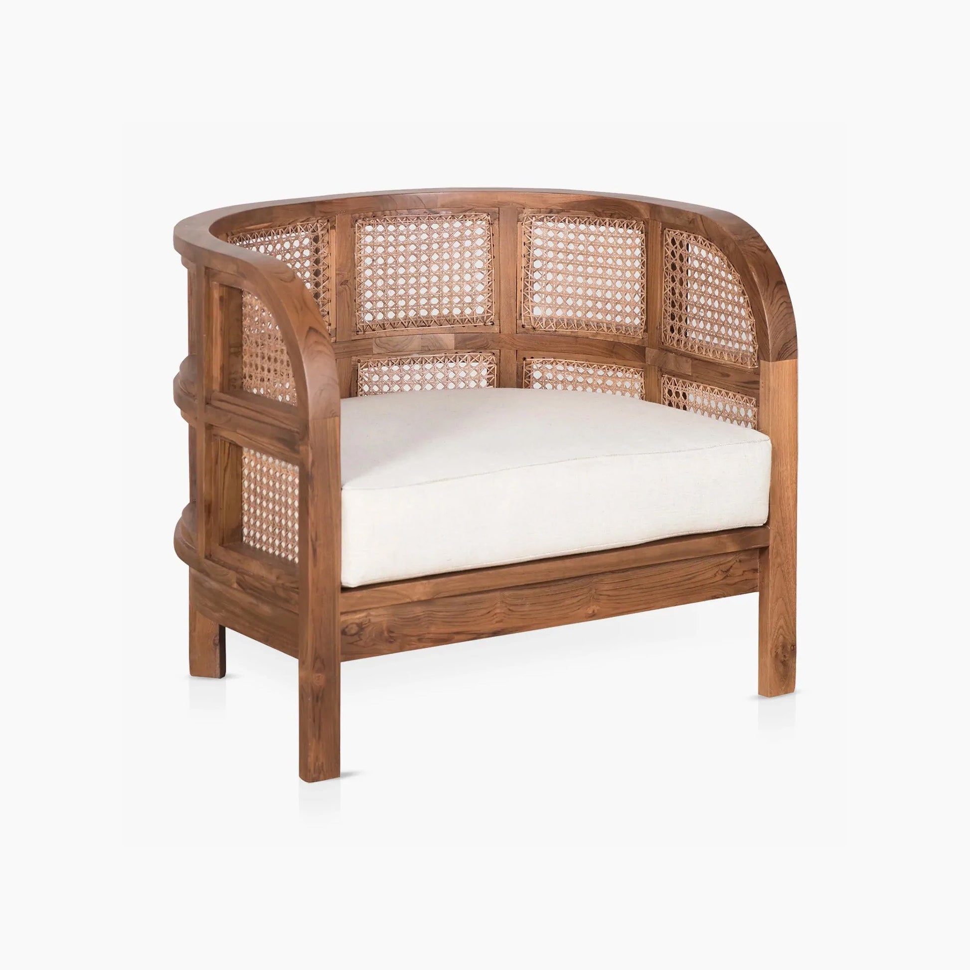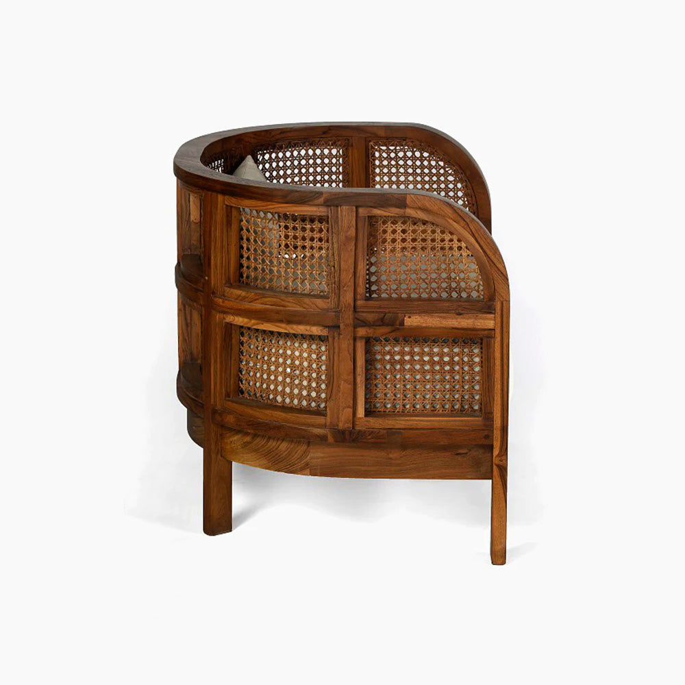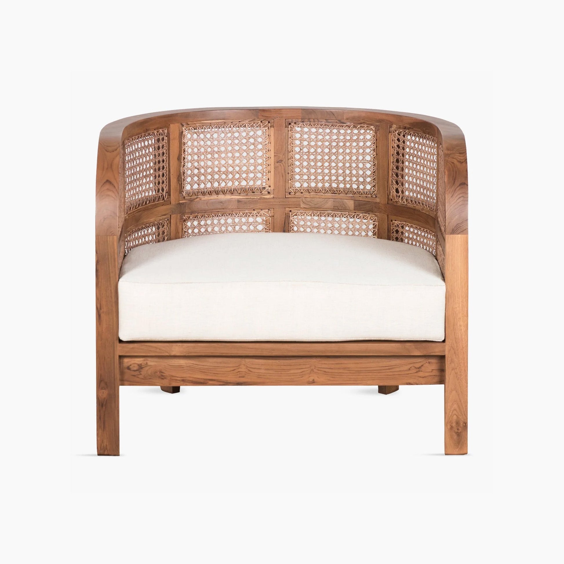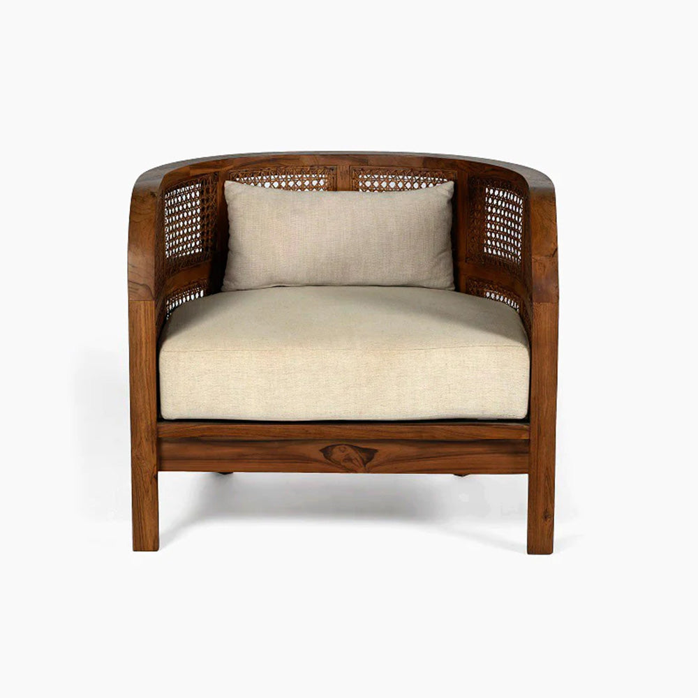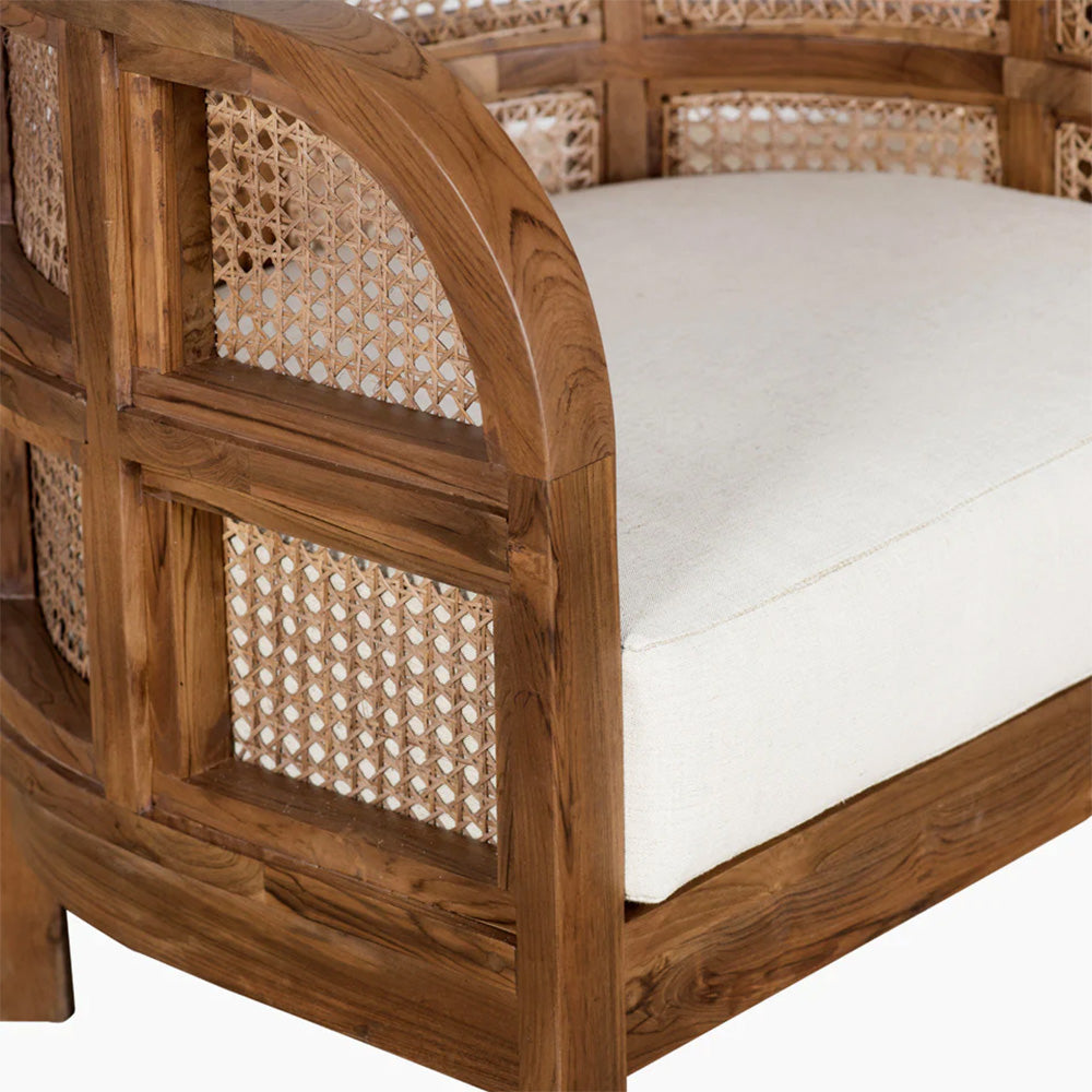 Embracing nature's forms, our Seeker Chair is made using recycled teak, hand-knotted cane, and natural linen.