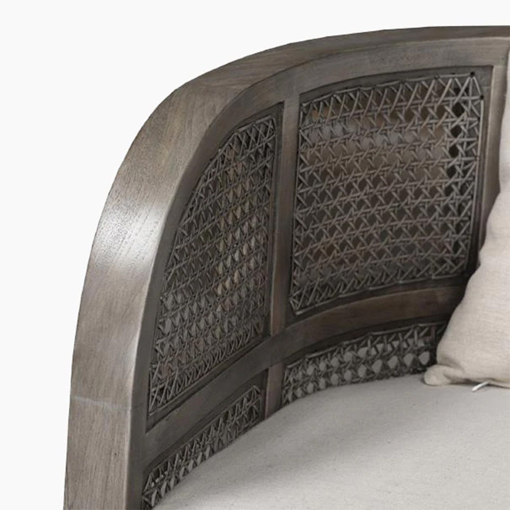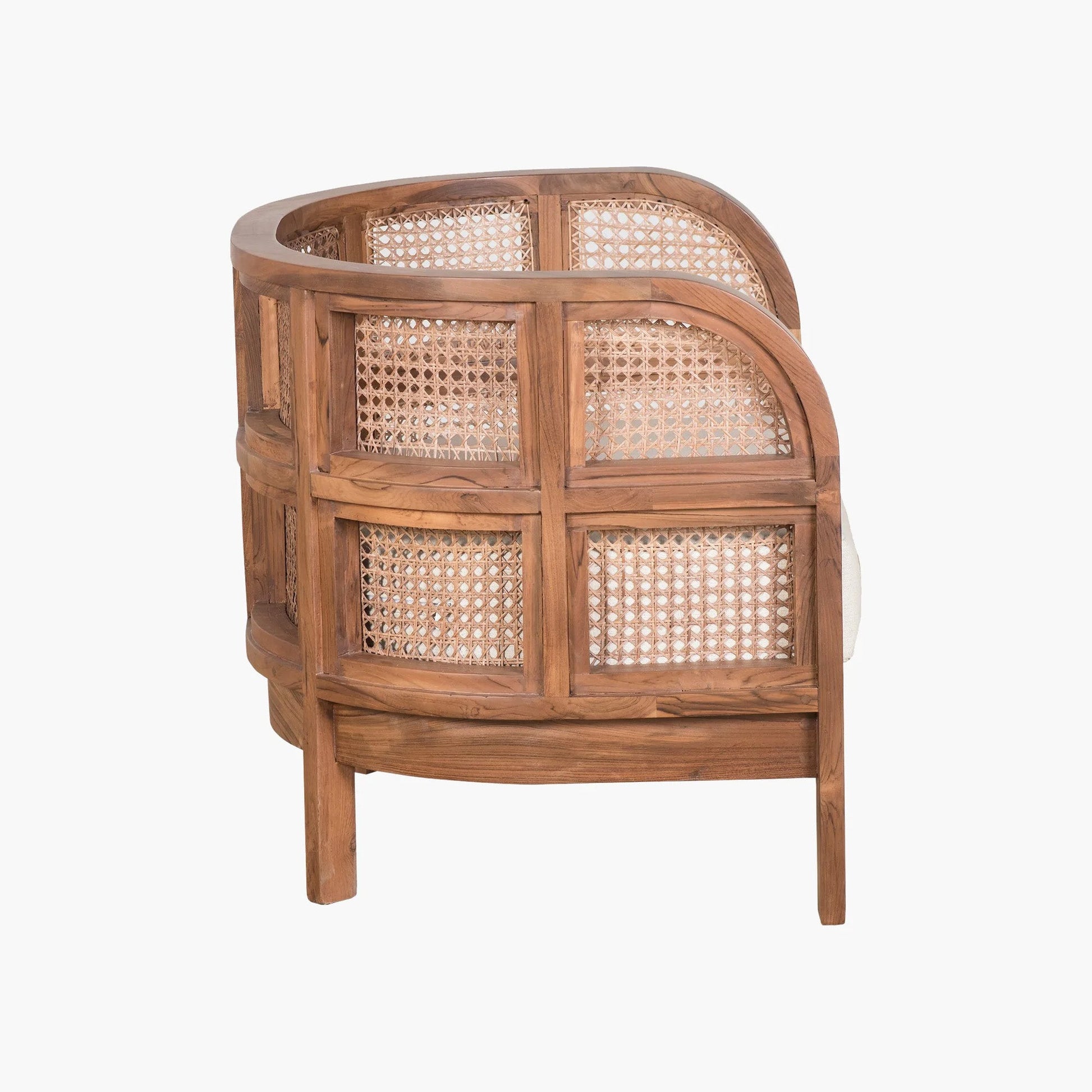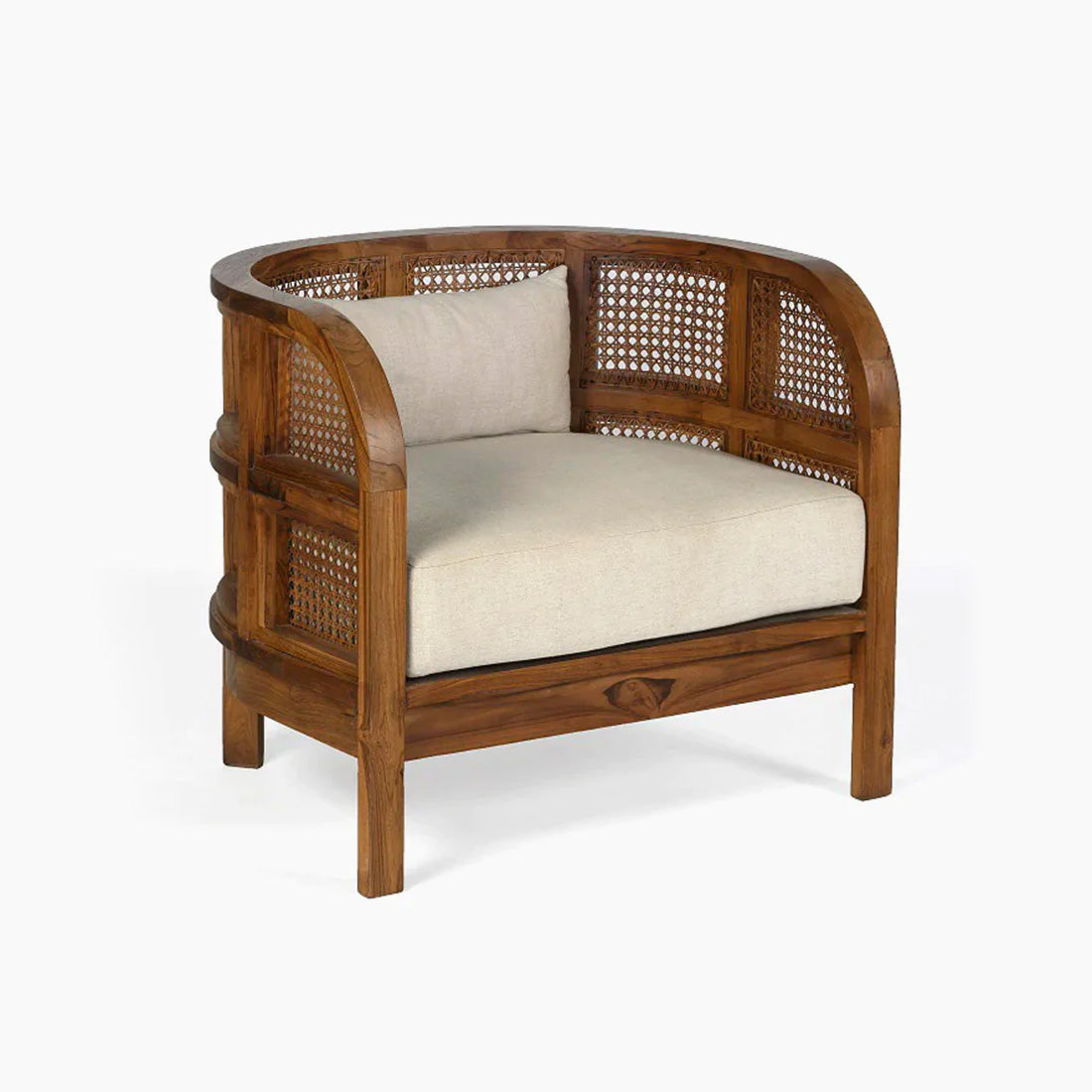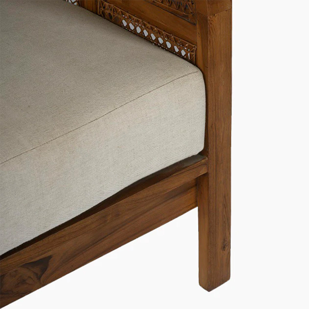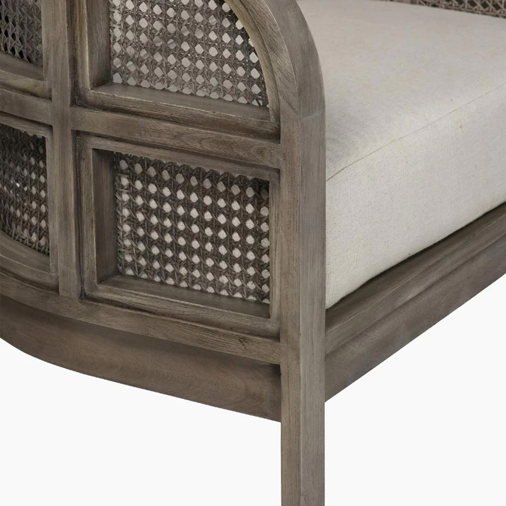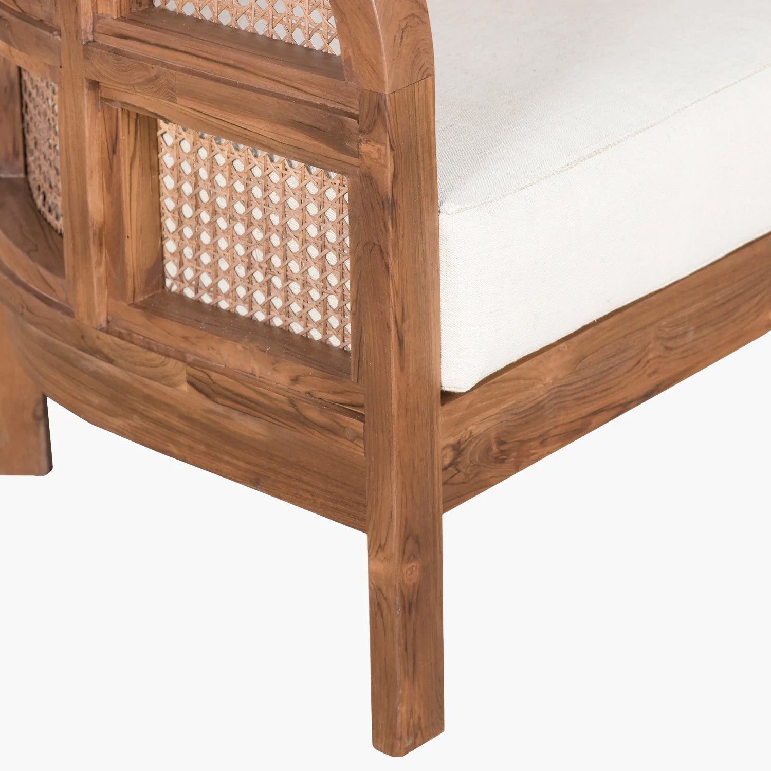 Embracing nature's forms, our Seeker Chair is made using recycled teak, hand-knotted cane, and natural linen.