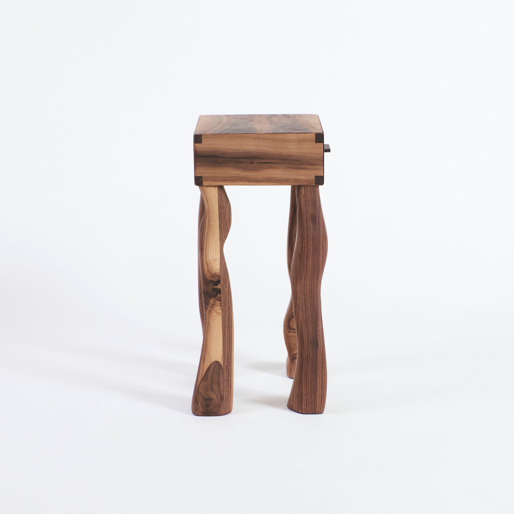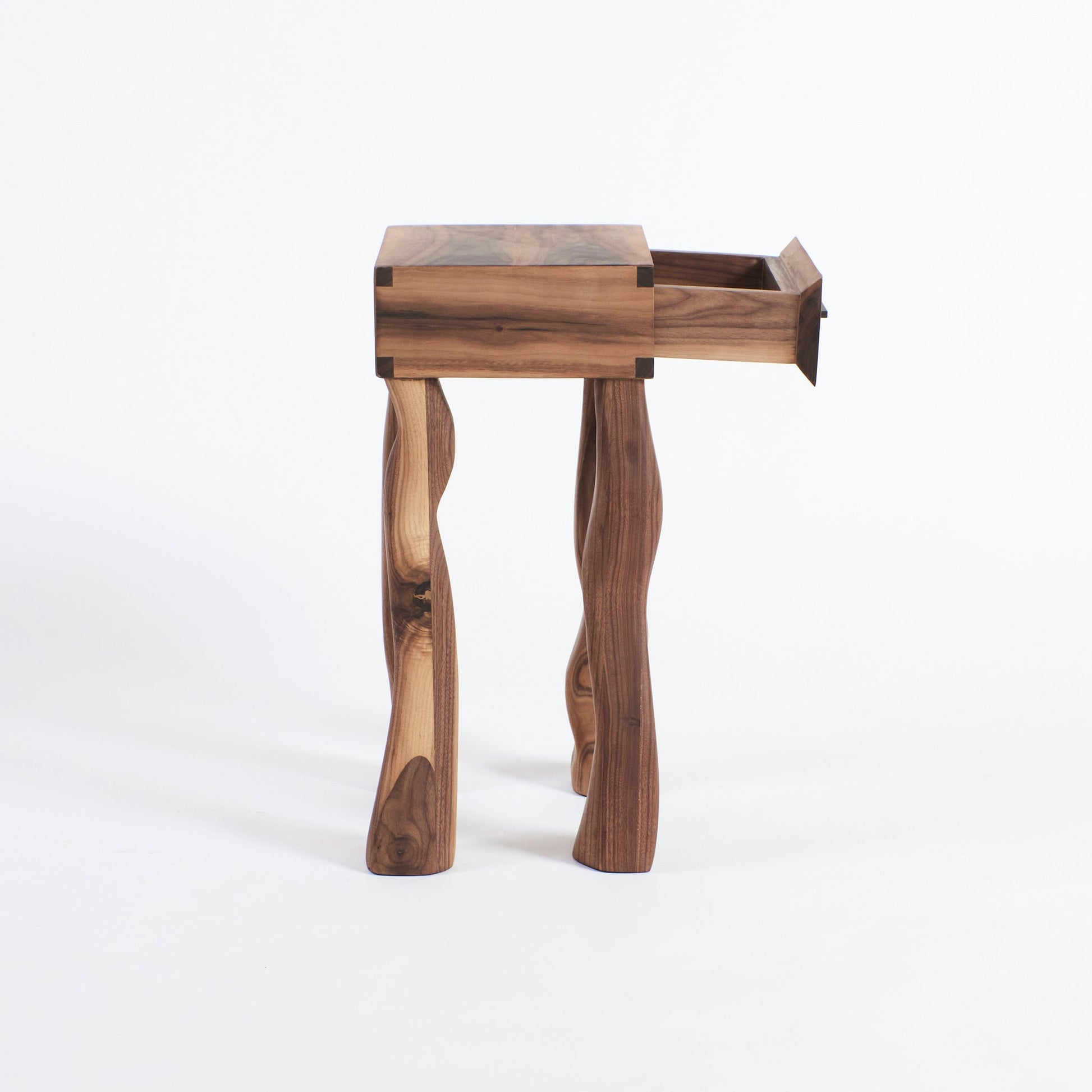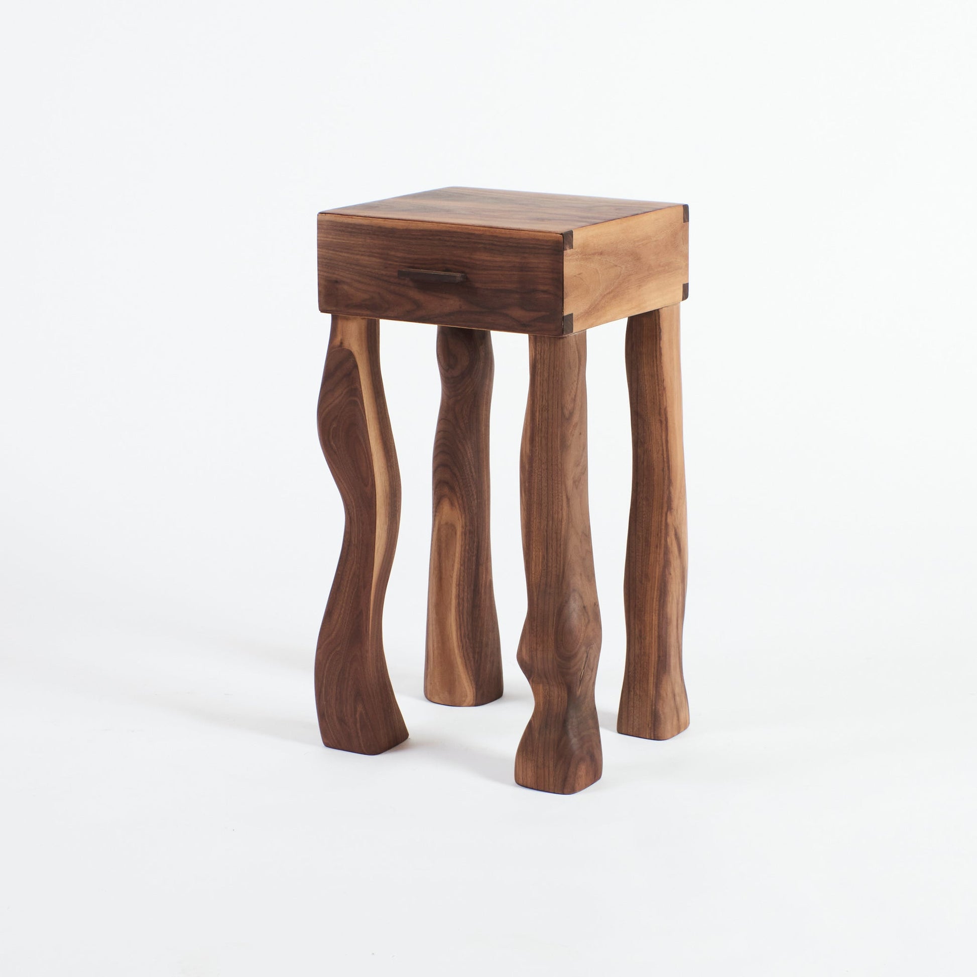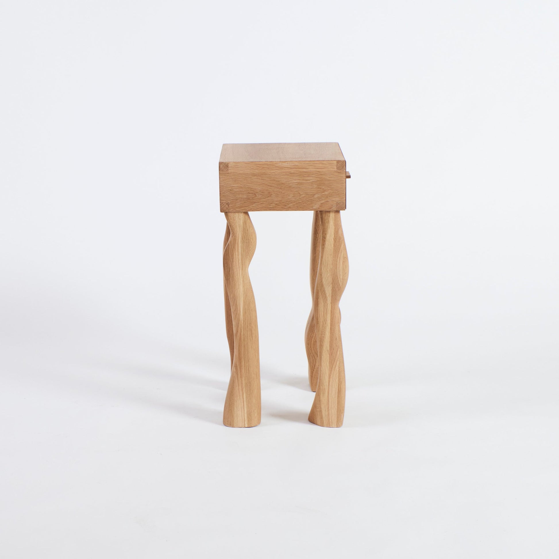 The Side table is hand carved by skilled artisans in Northern Portugal. The table is made from oak with carefully designed jointing details. The drawer stands on four irregular legs. The piece is available to order as single or as a pair. Also available with the foot detail. Please note wood is a natural material and the pattern and shades of brown can vary, making each piece unique.