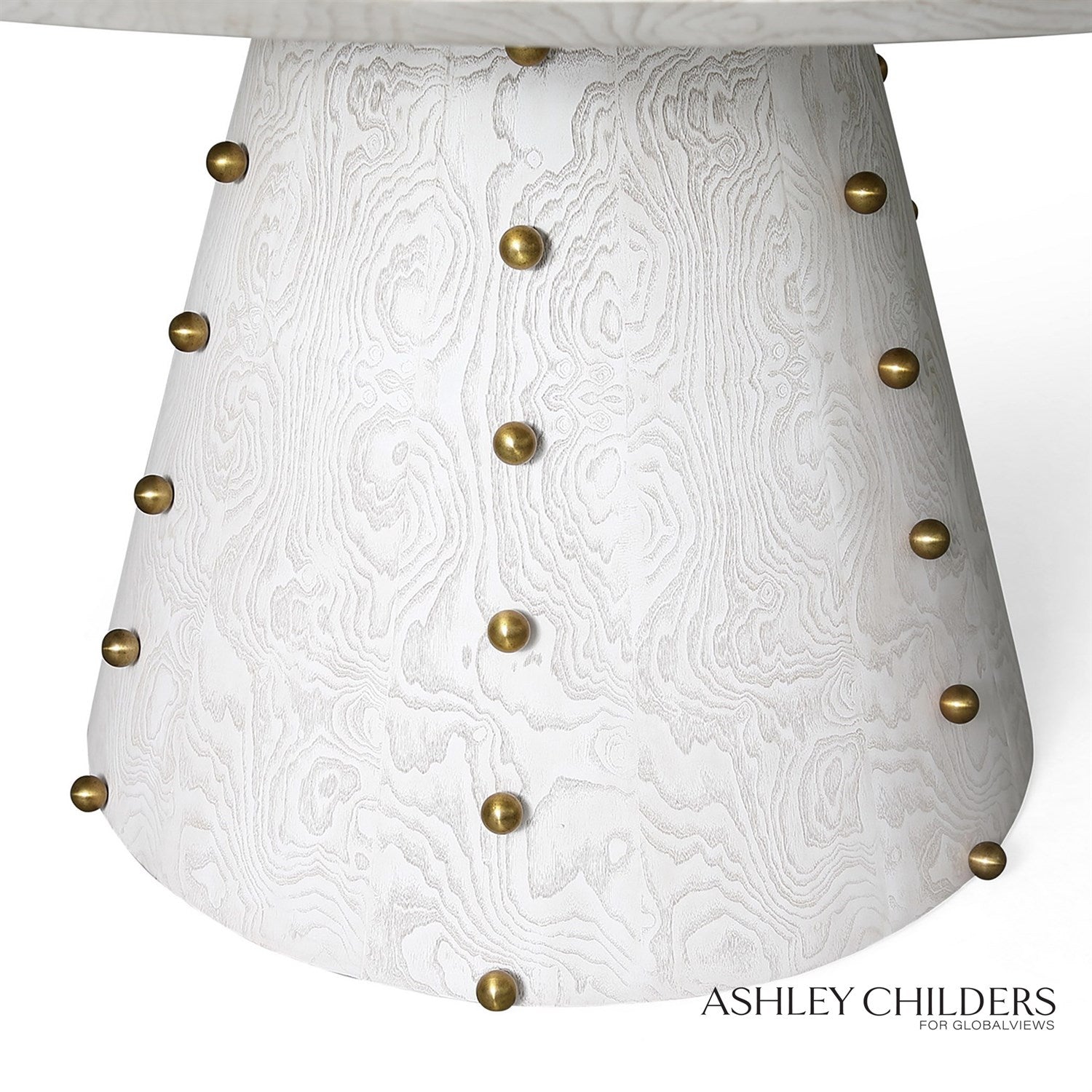 Drawing from her love of modern forms and chic material mixes, Ashley Childers designed our Spheres table collection to meld modern design with impeccable craftsmanship. Each table features hand-matched veneers in white burl finish. Hand cast brass ball details on the base finish off the unexpected and playful design.
