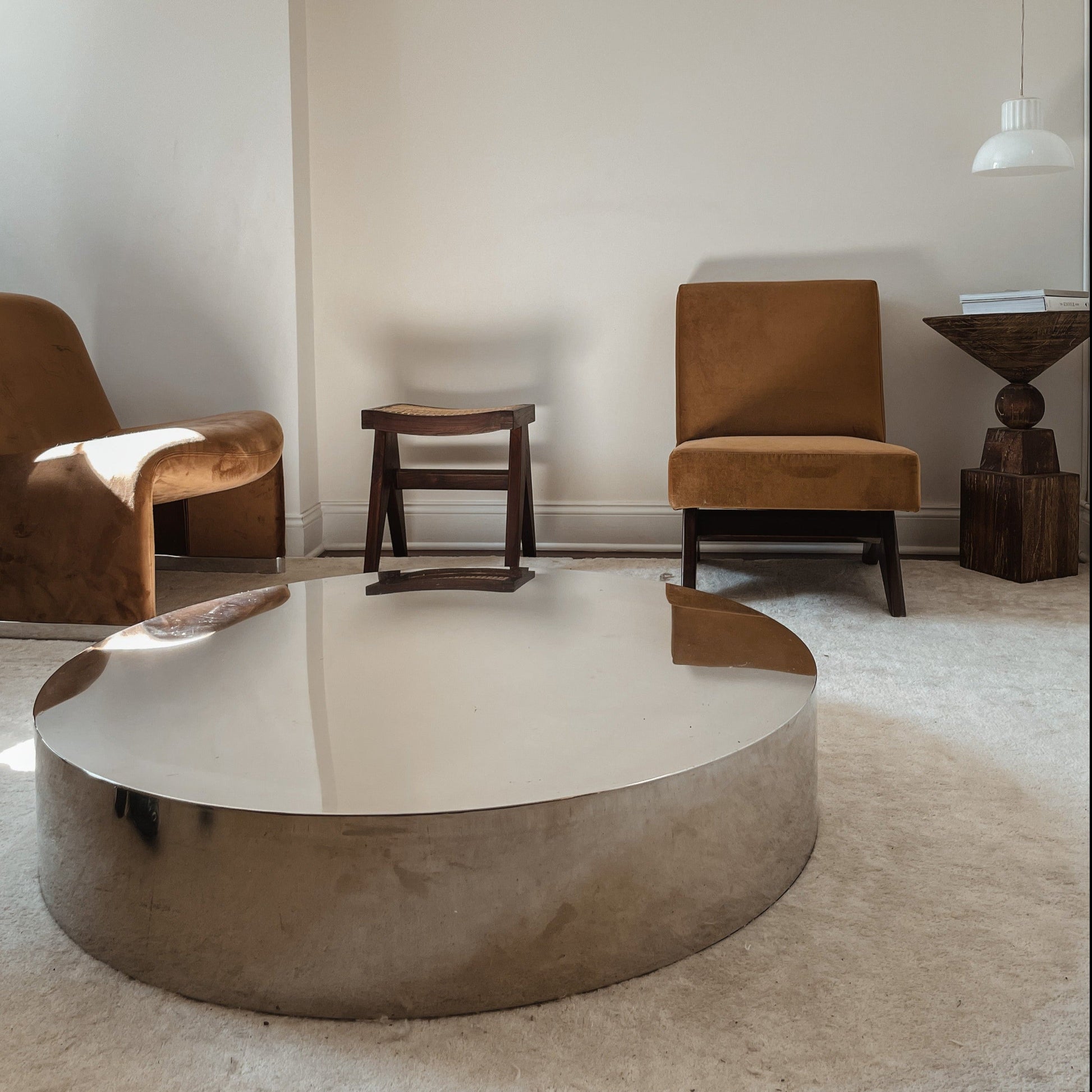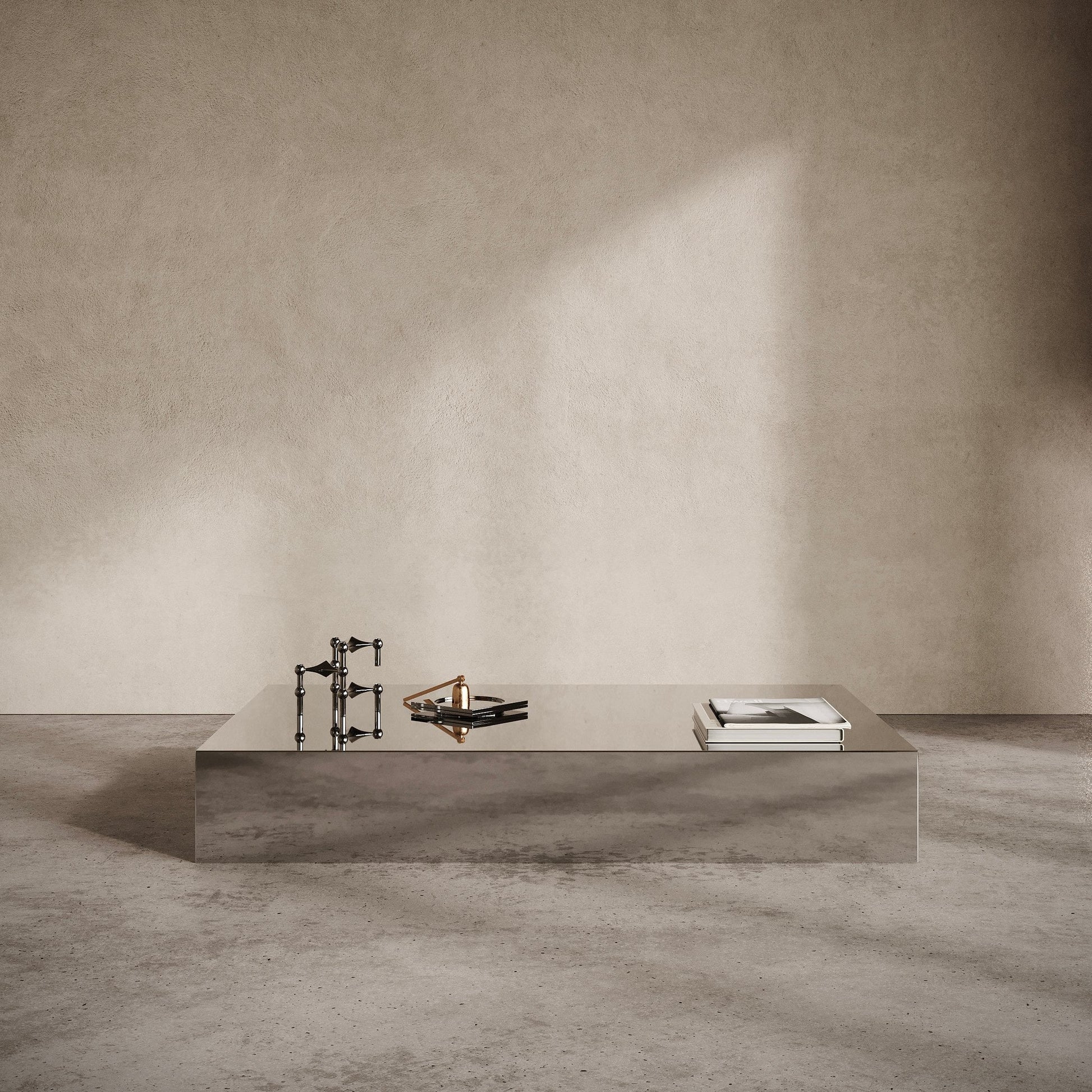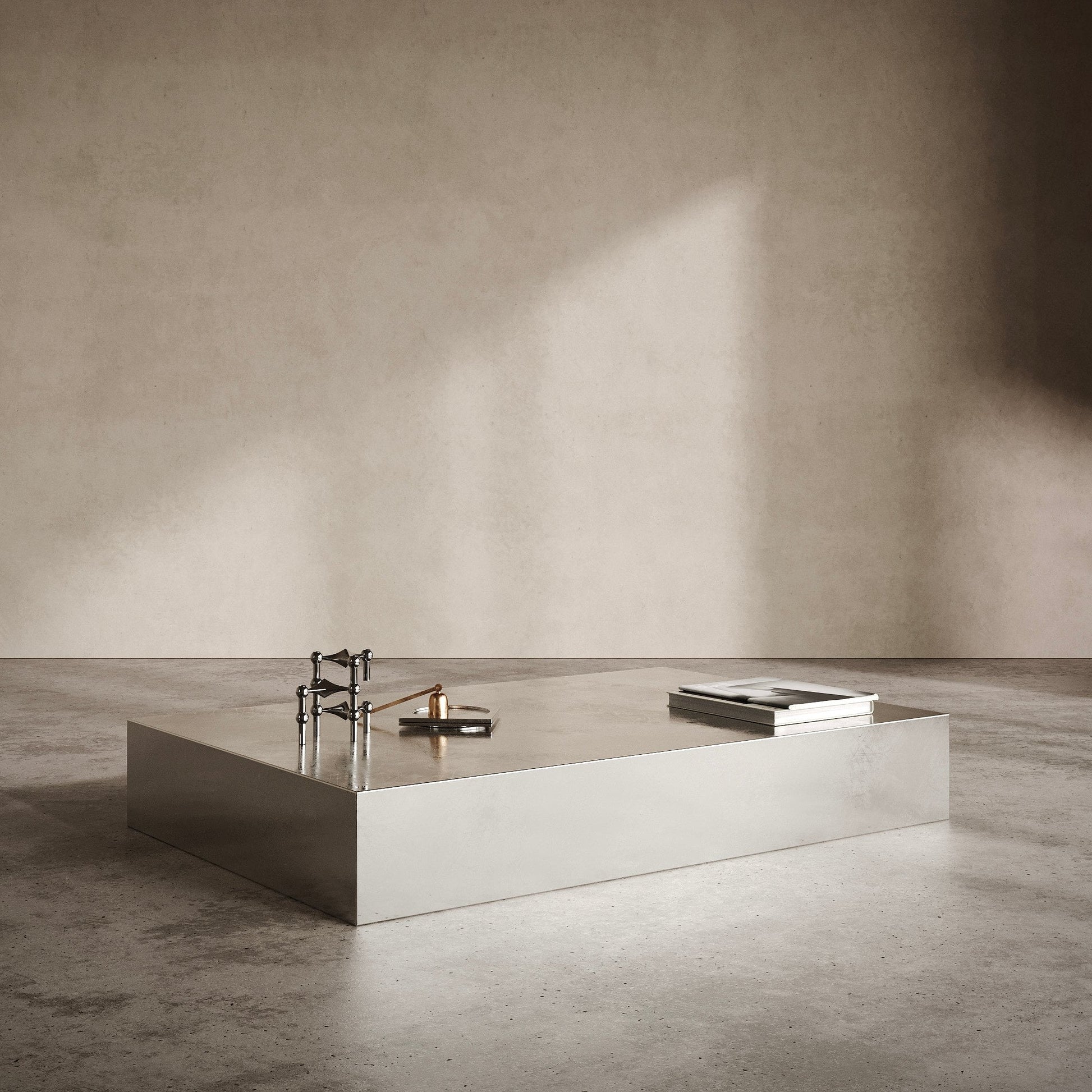 This is a sleek and modern stainless steel coffee table.