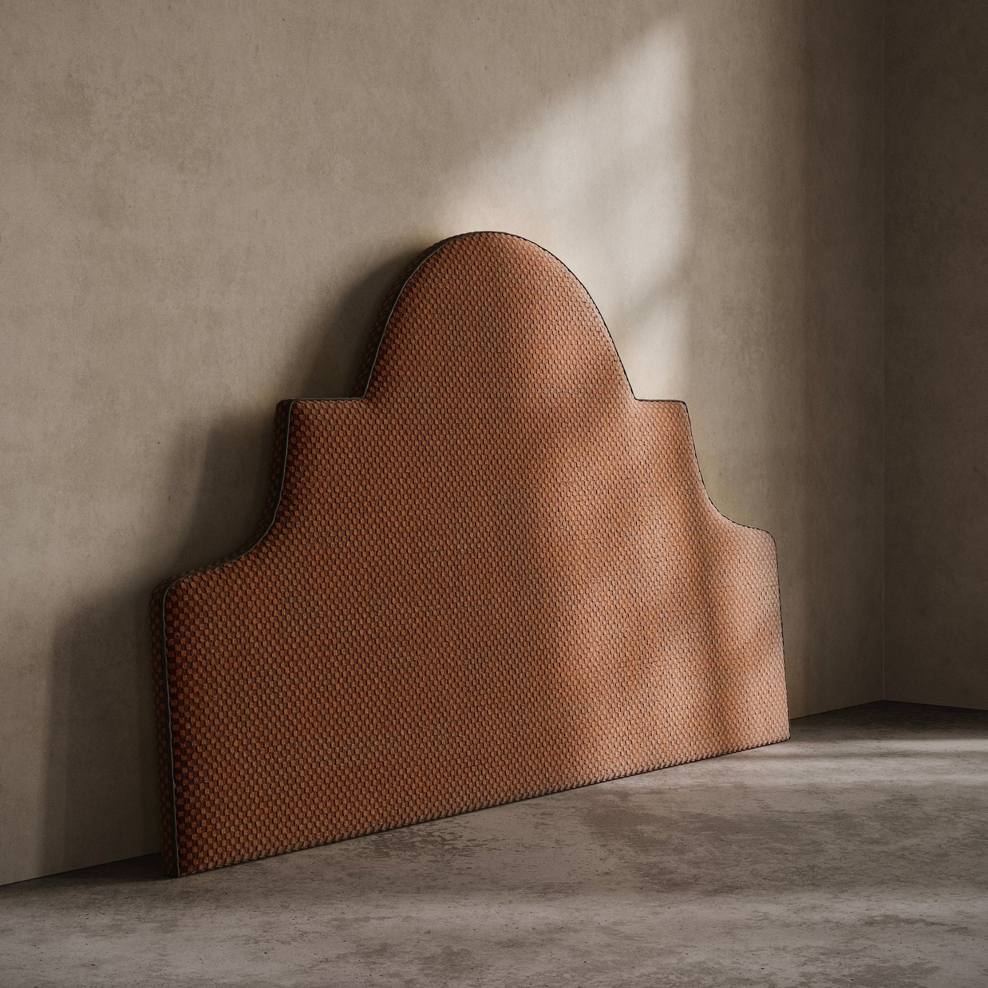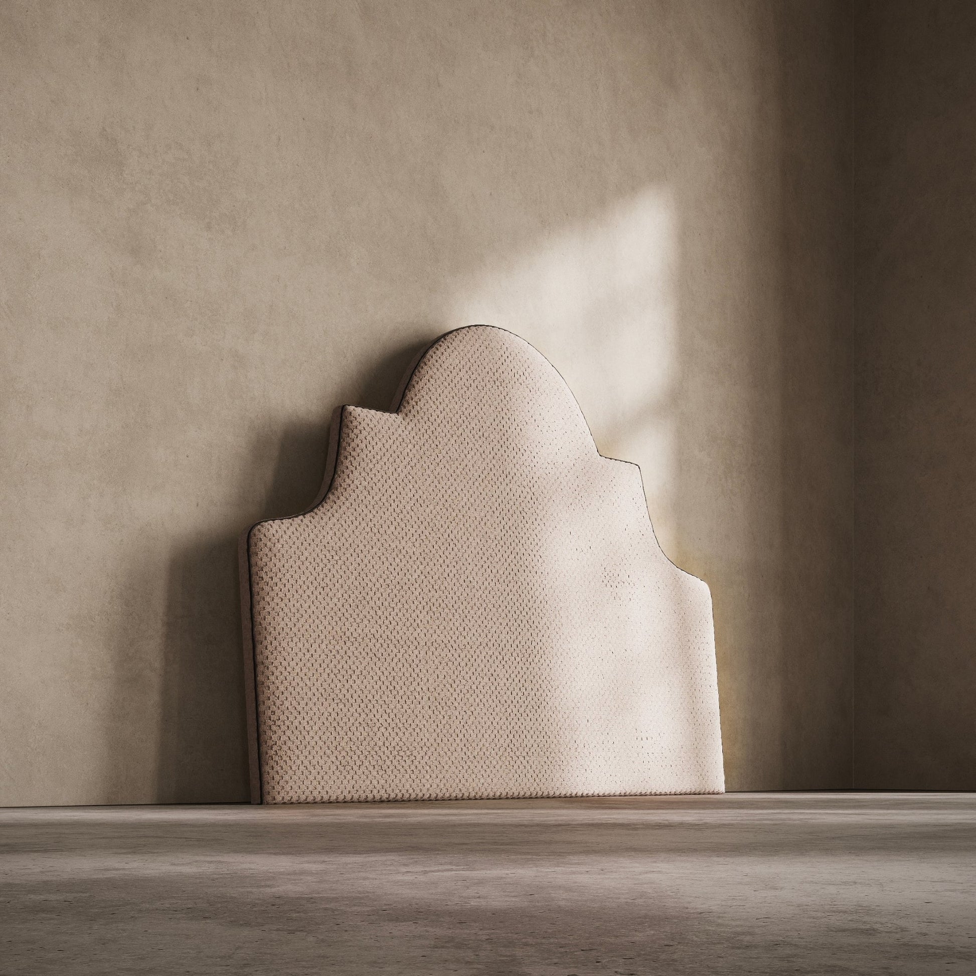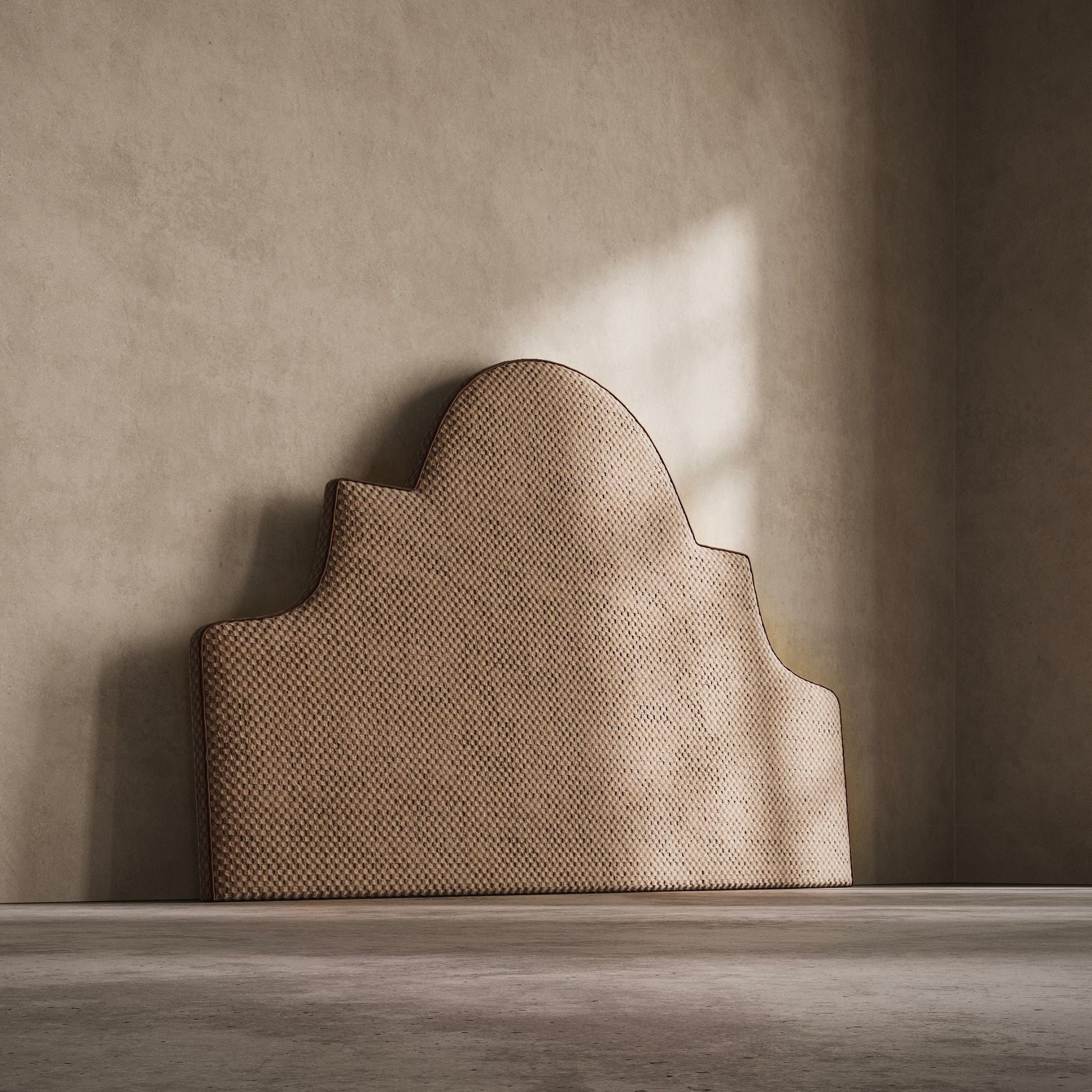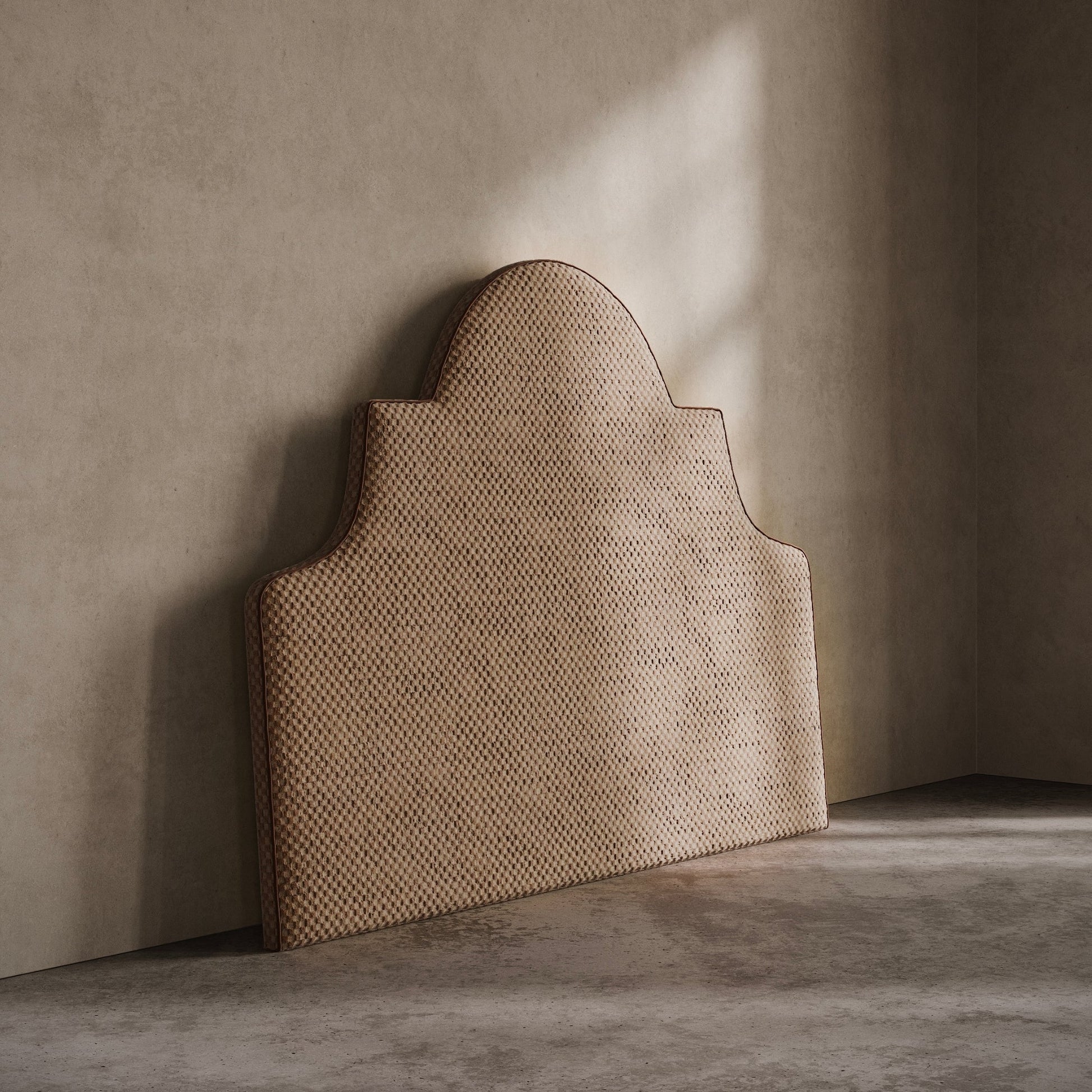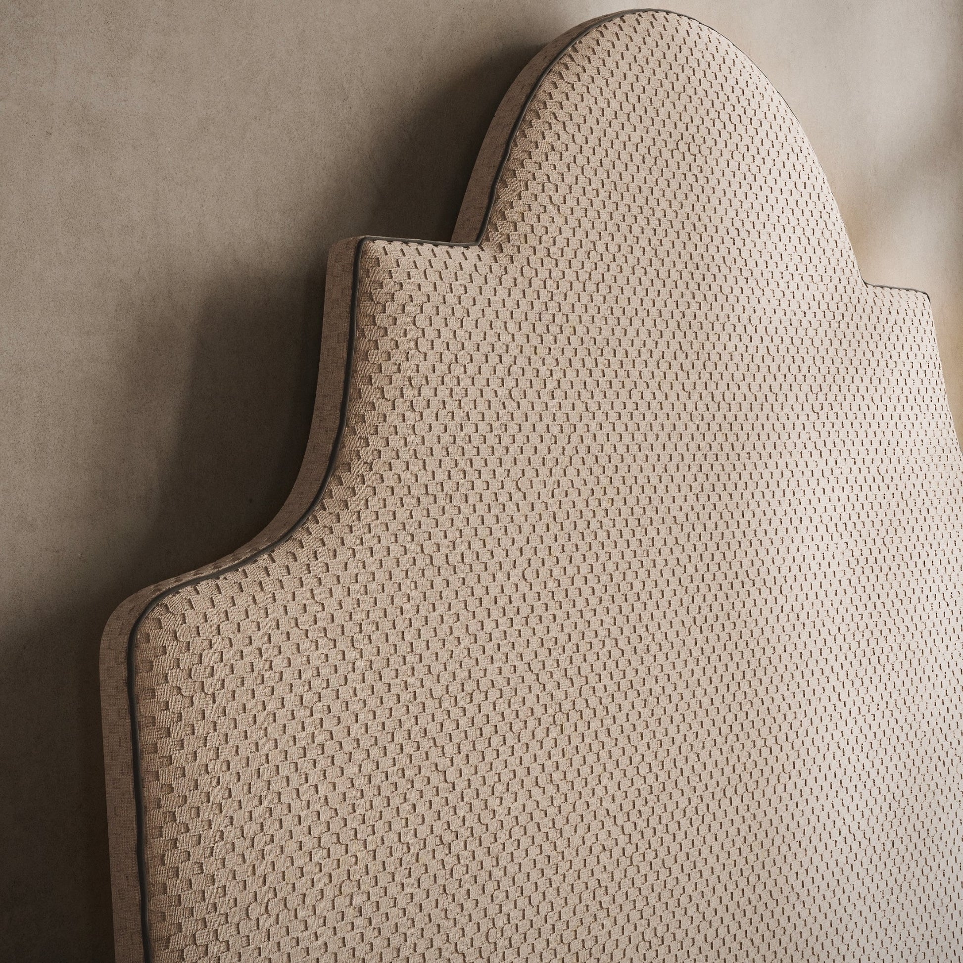 Headboard with wooden frame upholstered in selected fabric and black velvet trim. The perfect piece to give a unique and sophisticated touch to your bedroom.