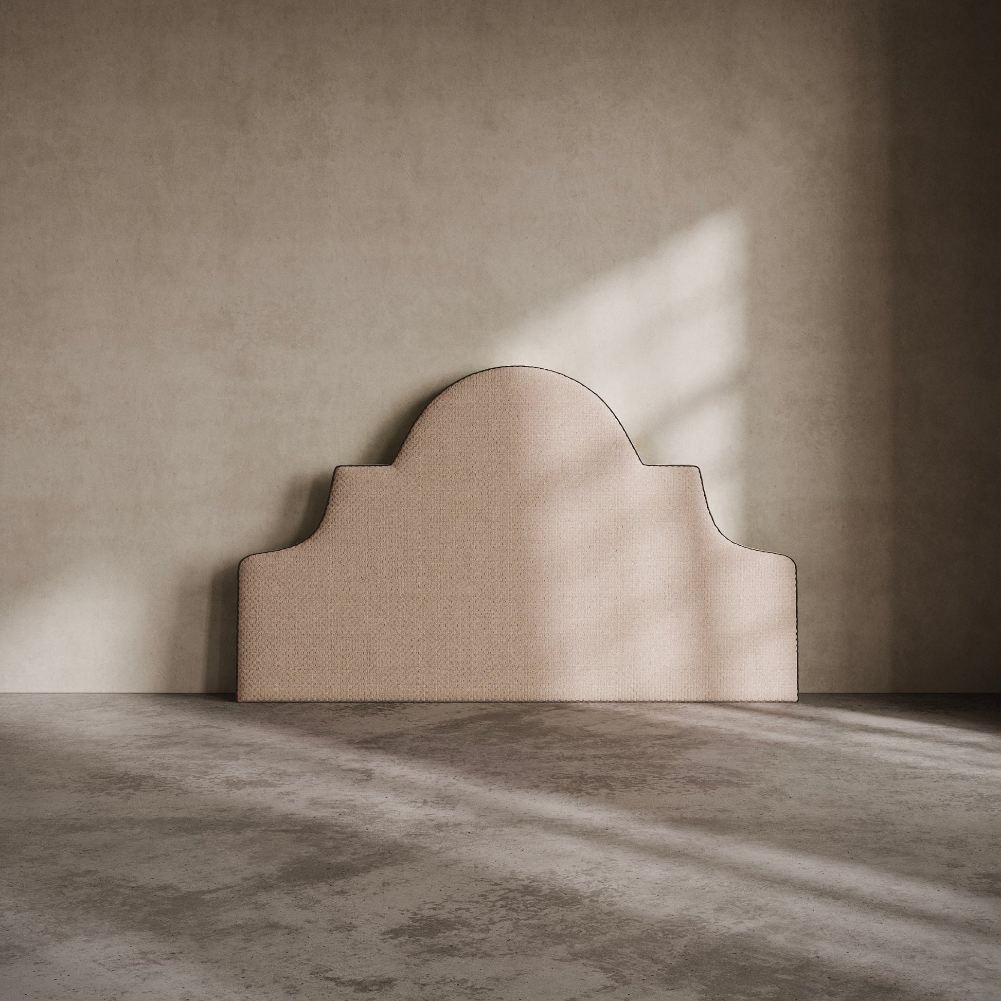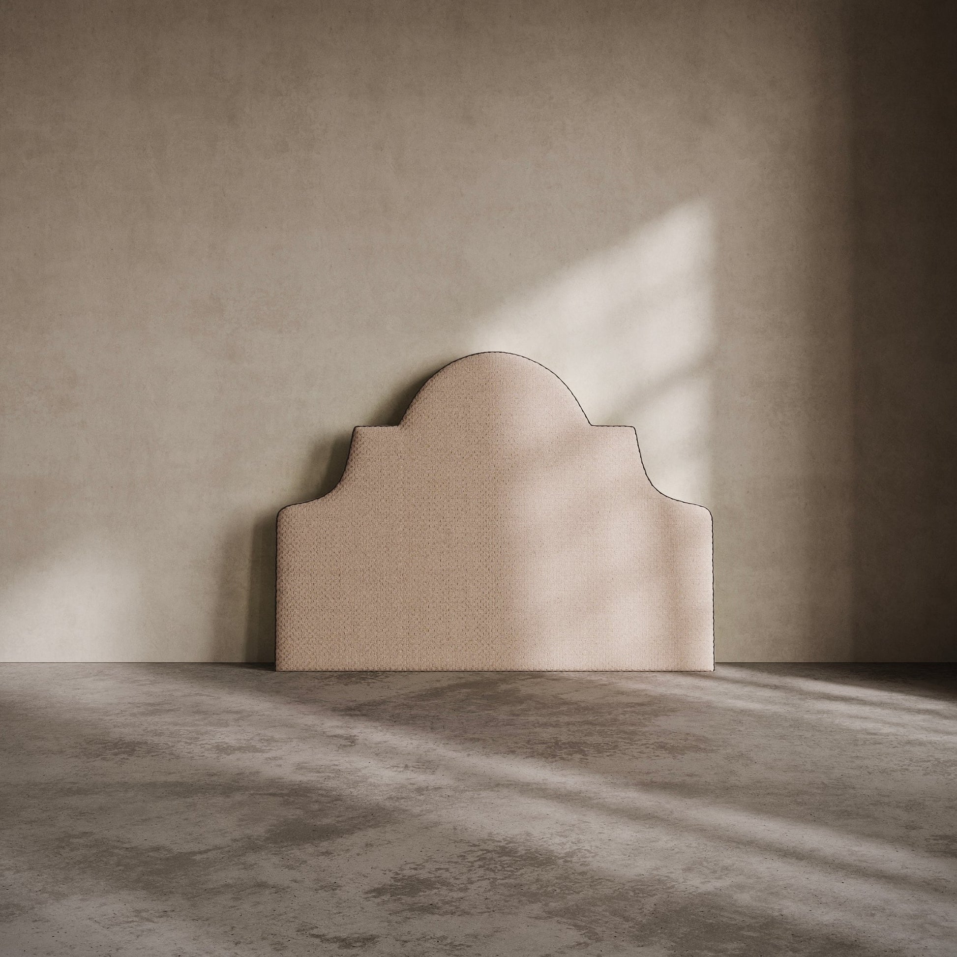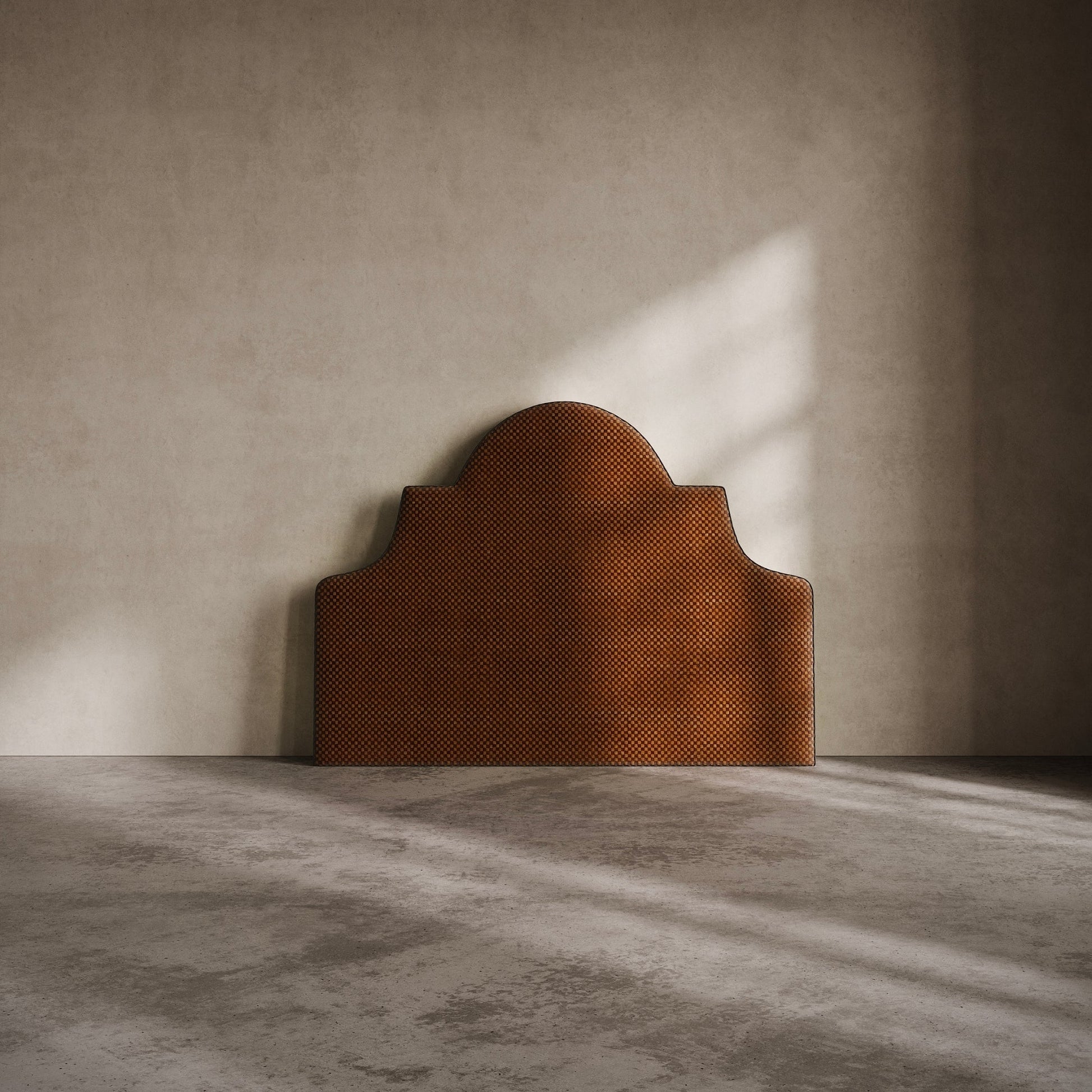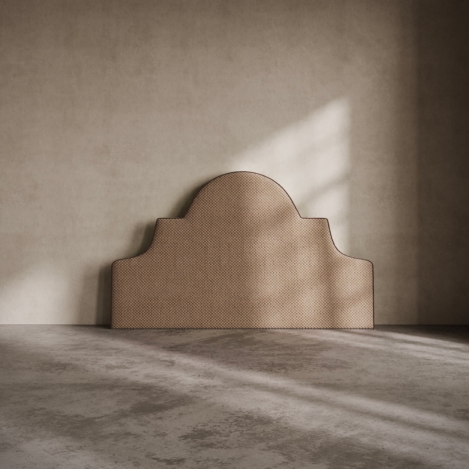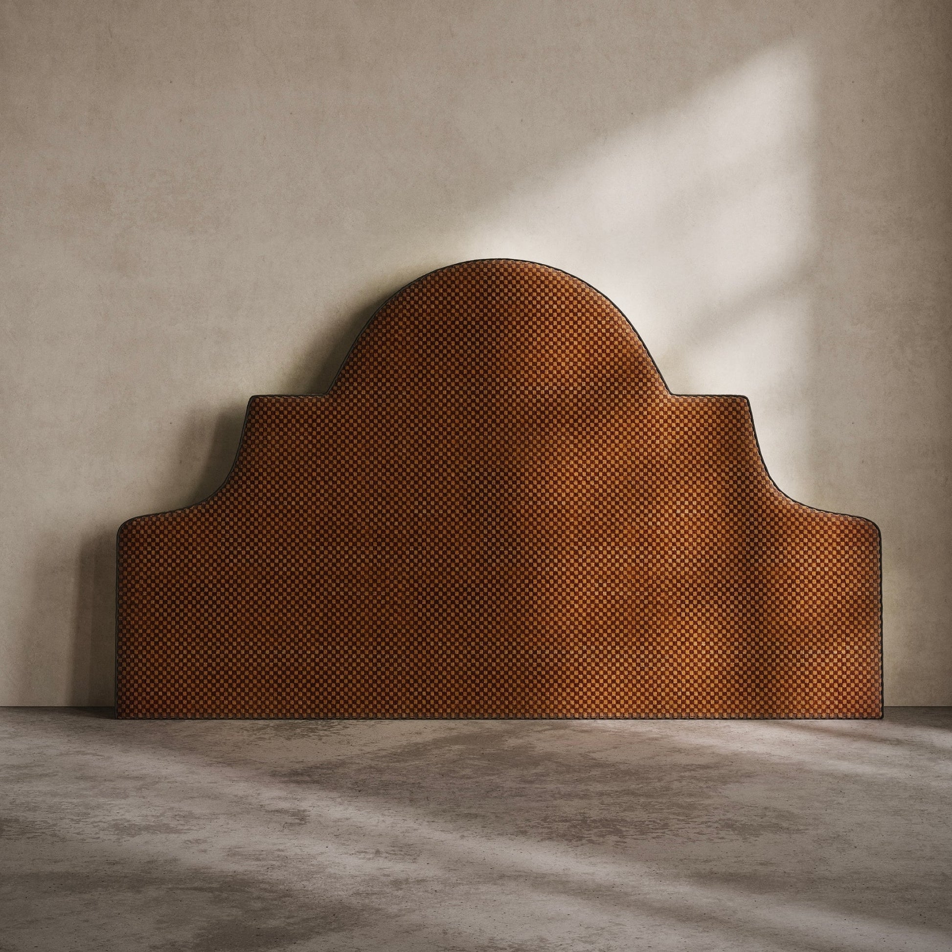 Headboard with wooden frame upholstered in selected fabric and black velvet trim. The perfect piece to give a unique and sophisticated touch to your bedroom.