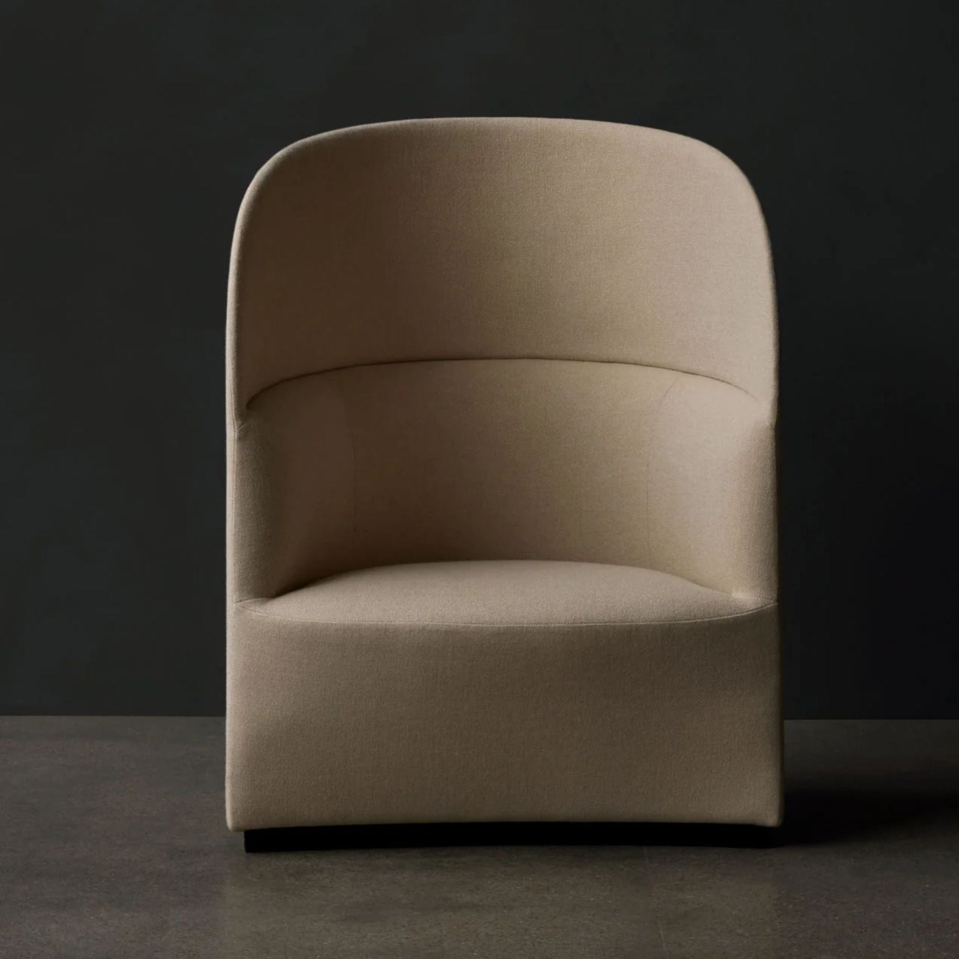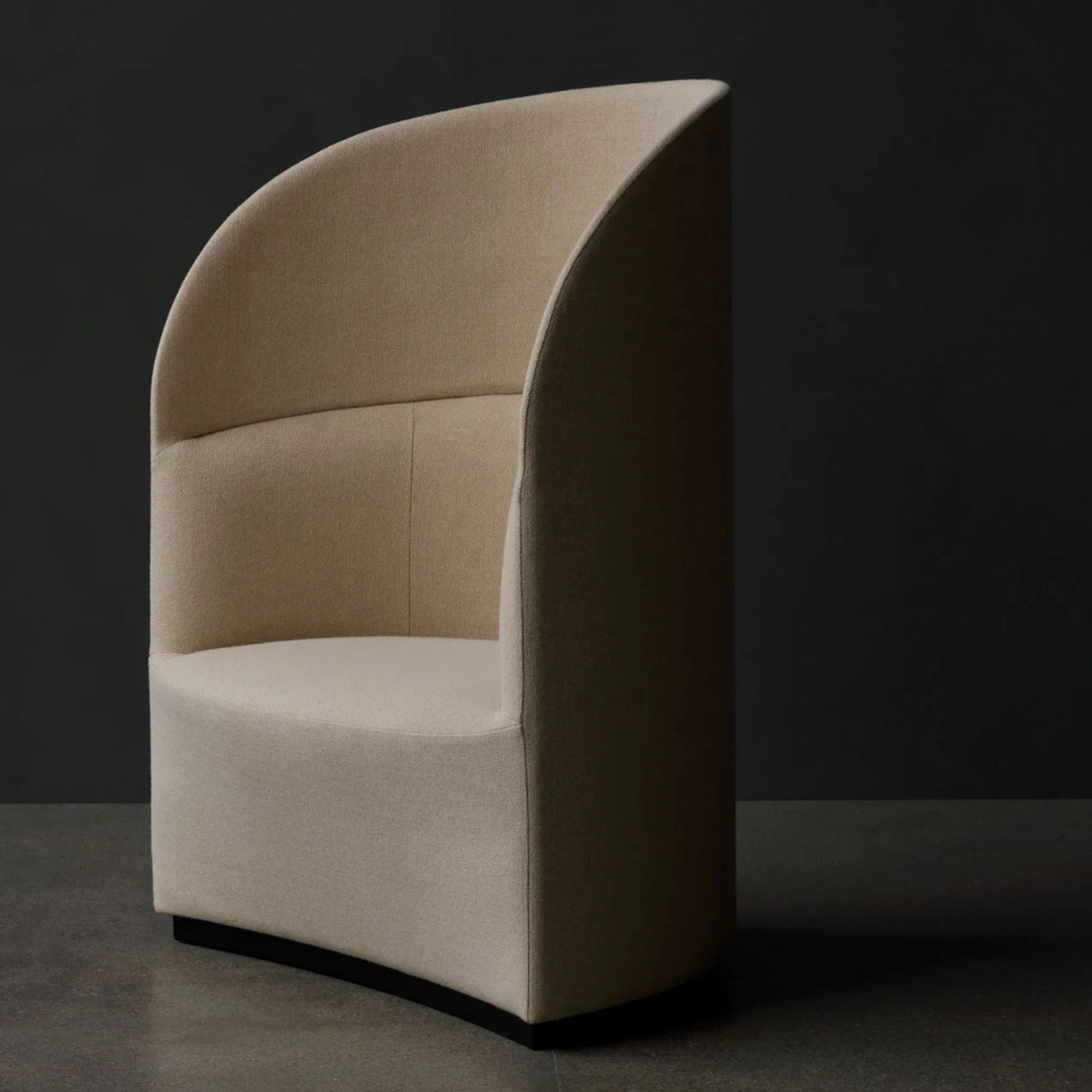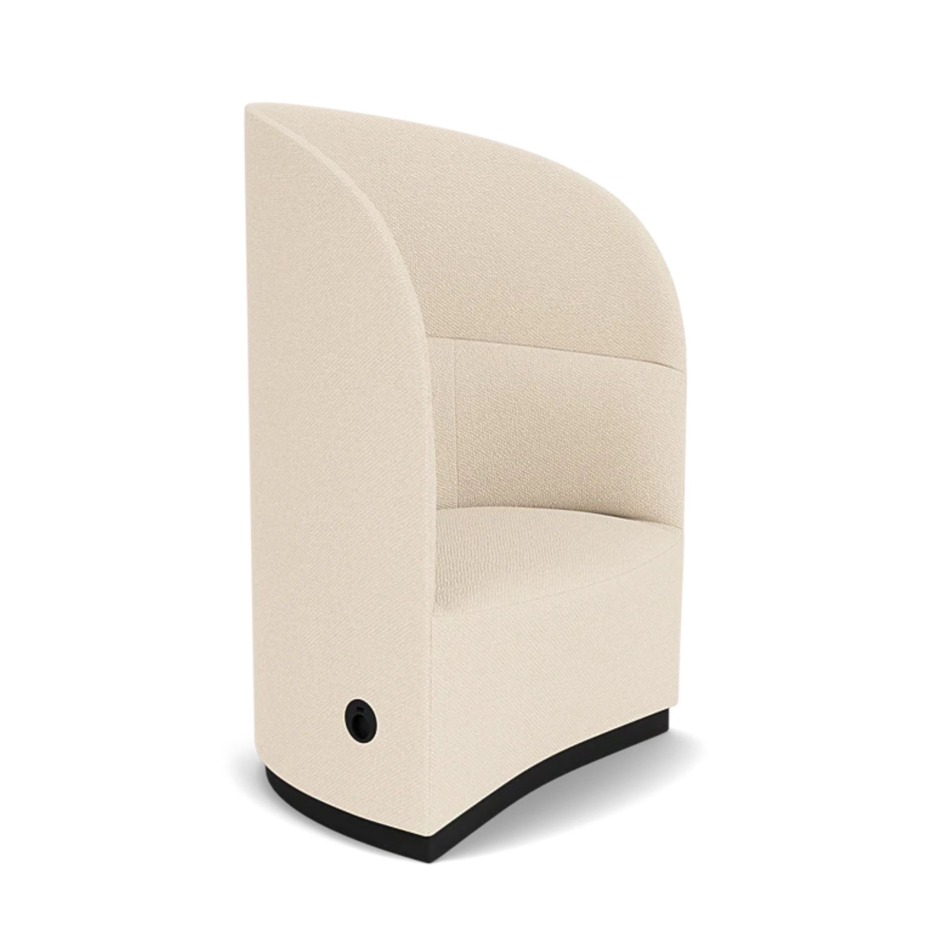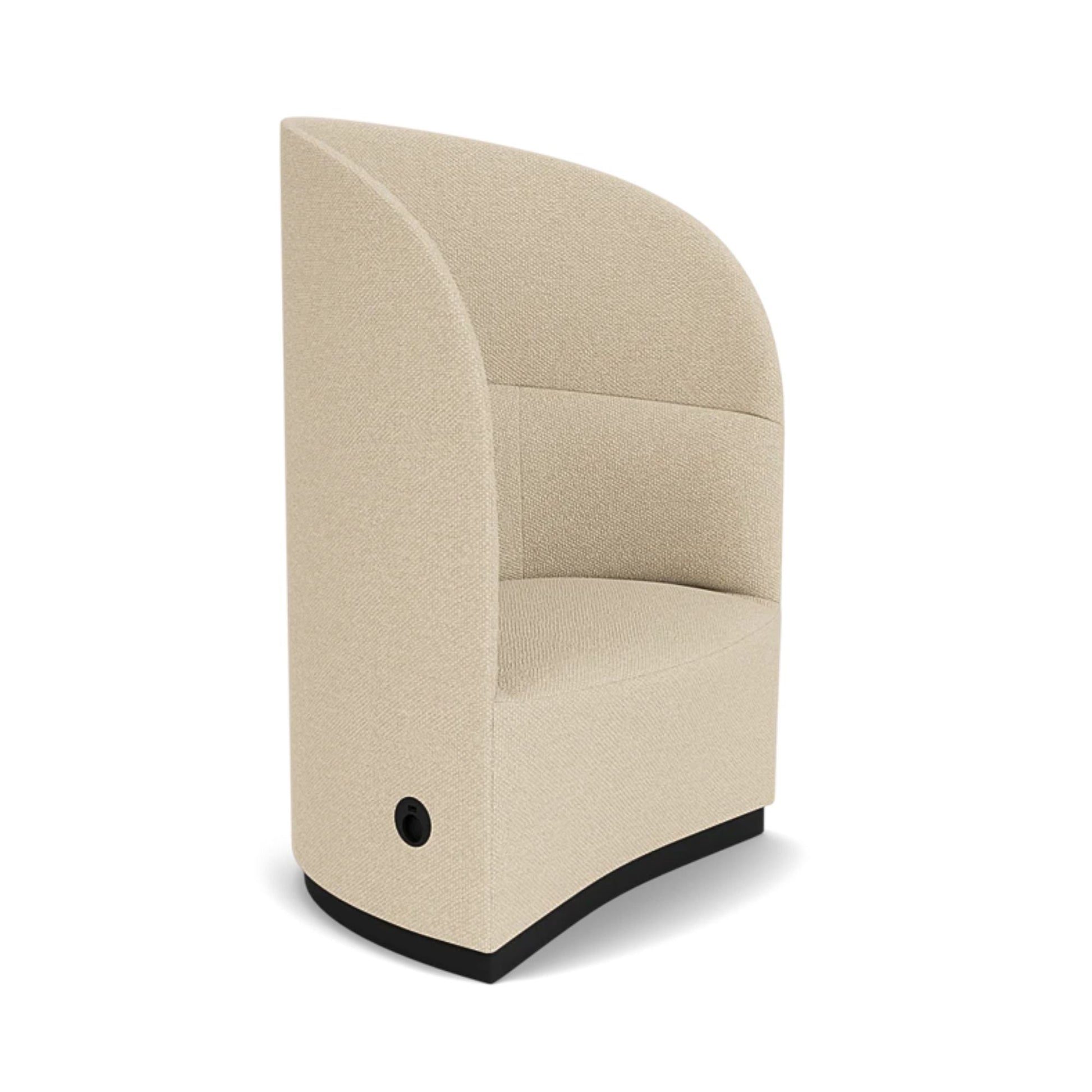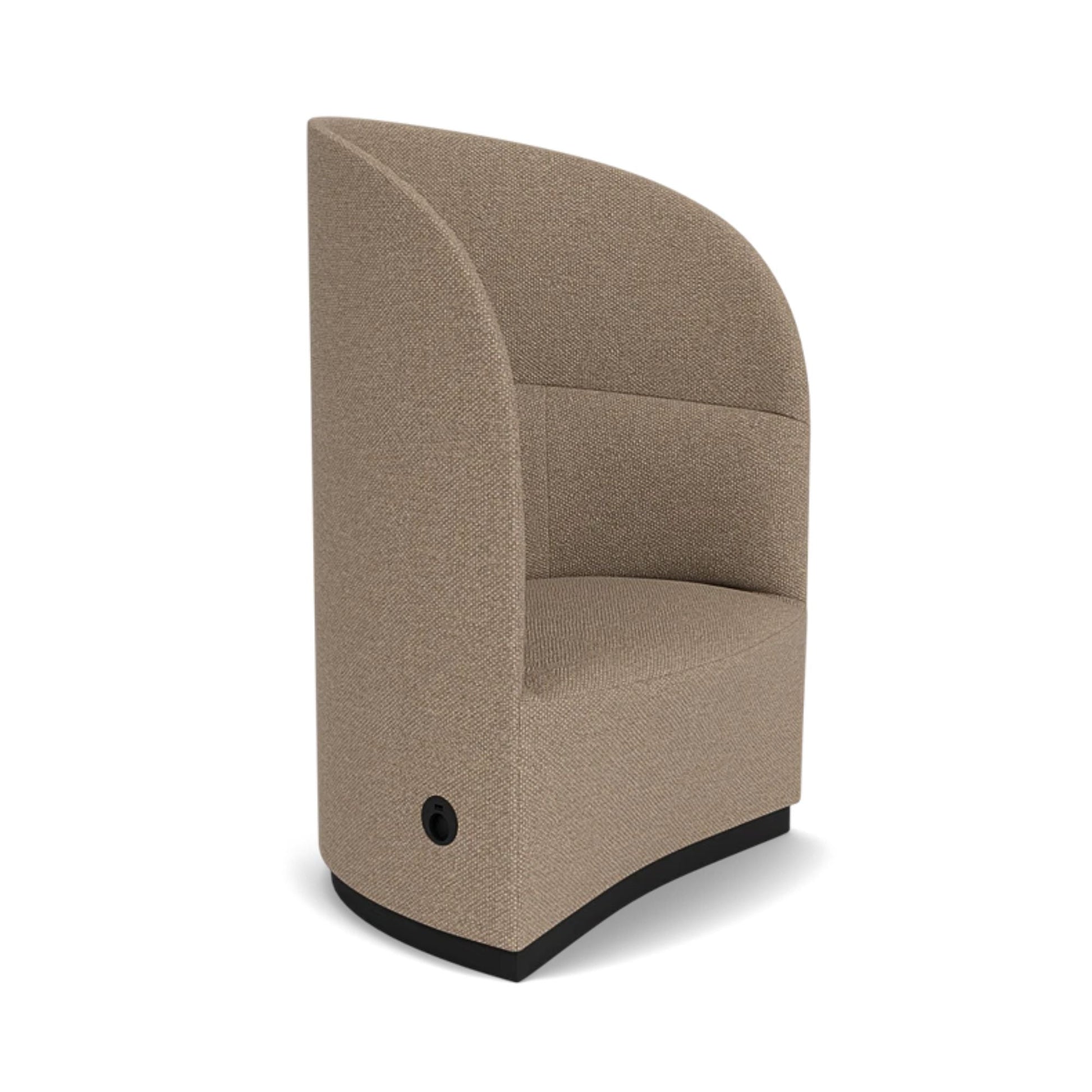 The high back version of the Tearoom Lounge Chair offers moments of quiet contemplation in busy spaces. Expressive and elegant, the secluded, foam-filled furniture piece rests on a wooden base for a natural contrast to the upholstered seat. The addition of a USB port and power socket at the base makes it a practical spot for work as well as play.