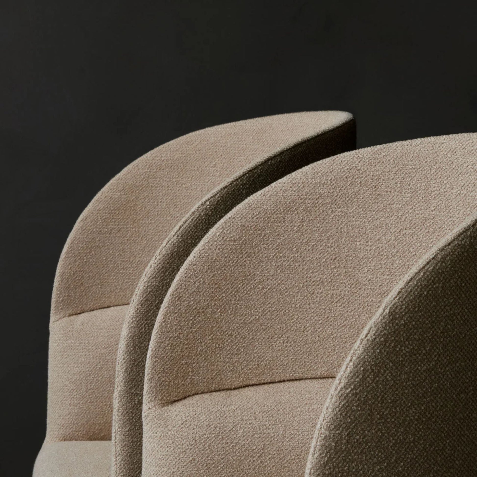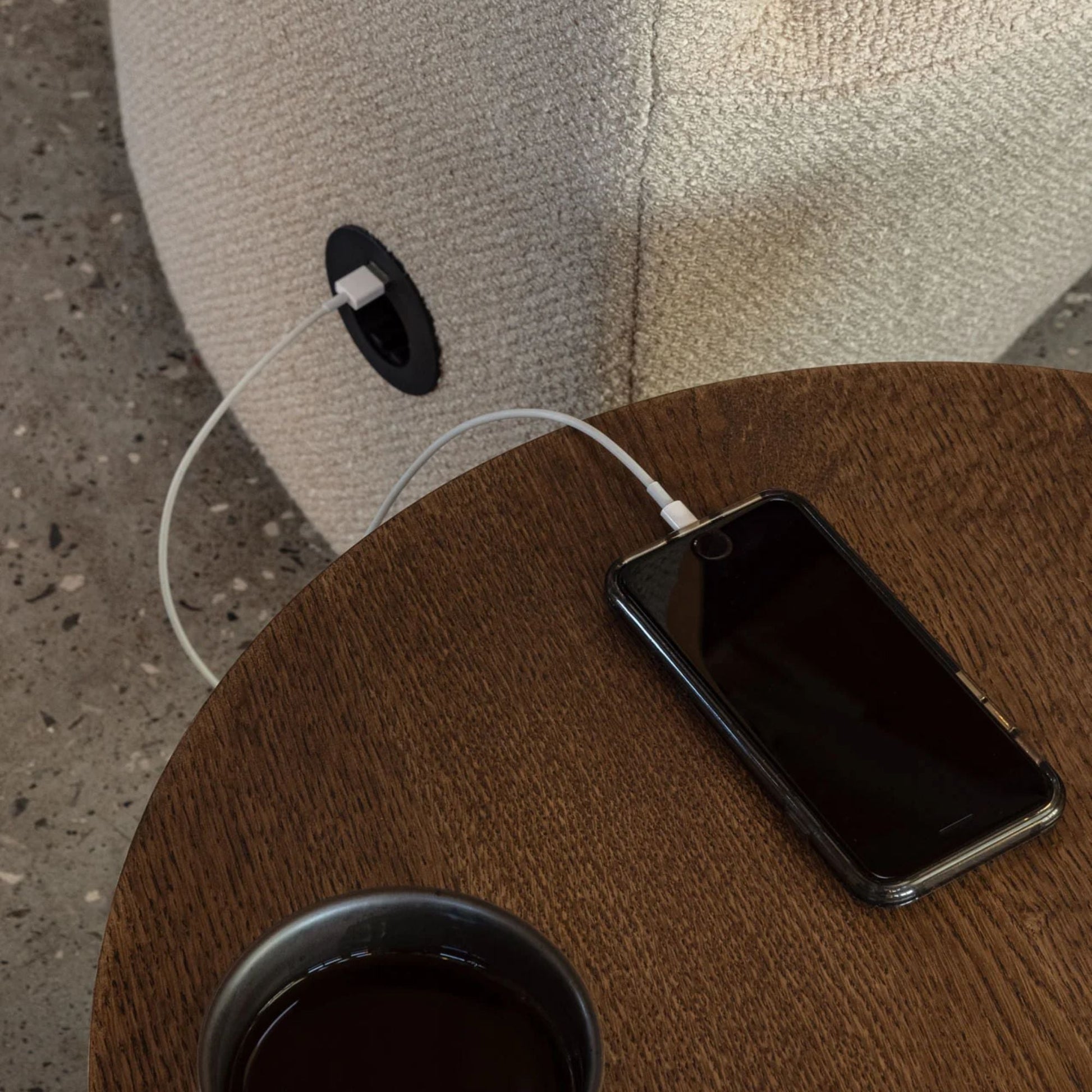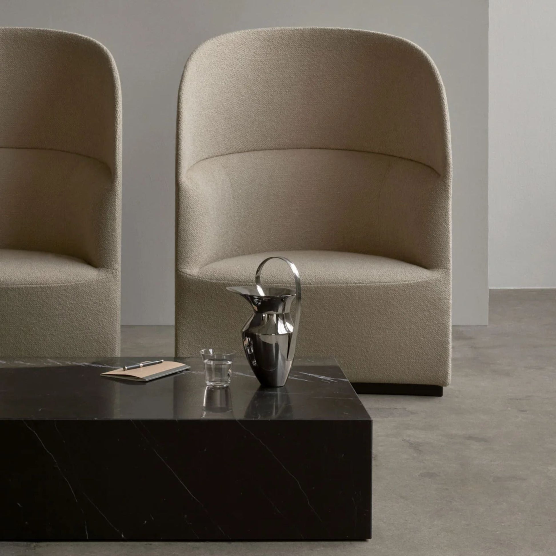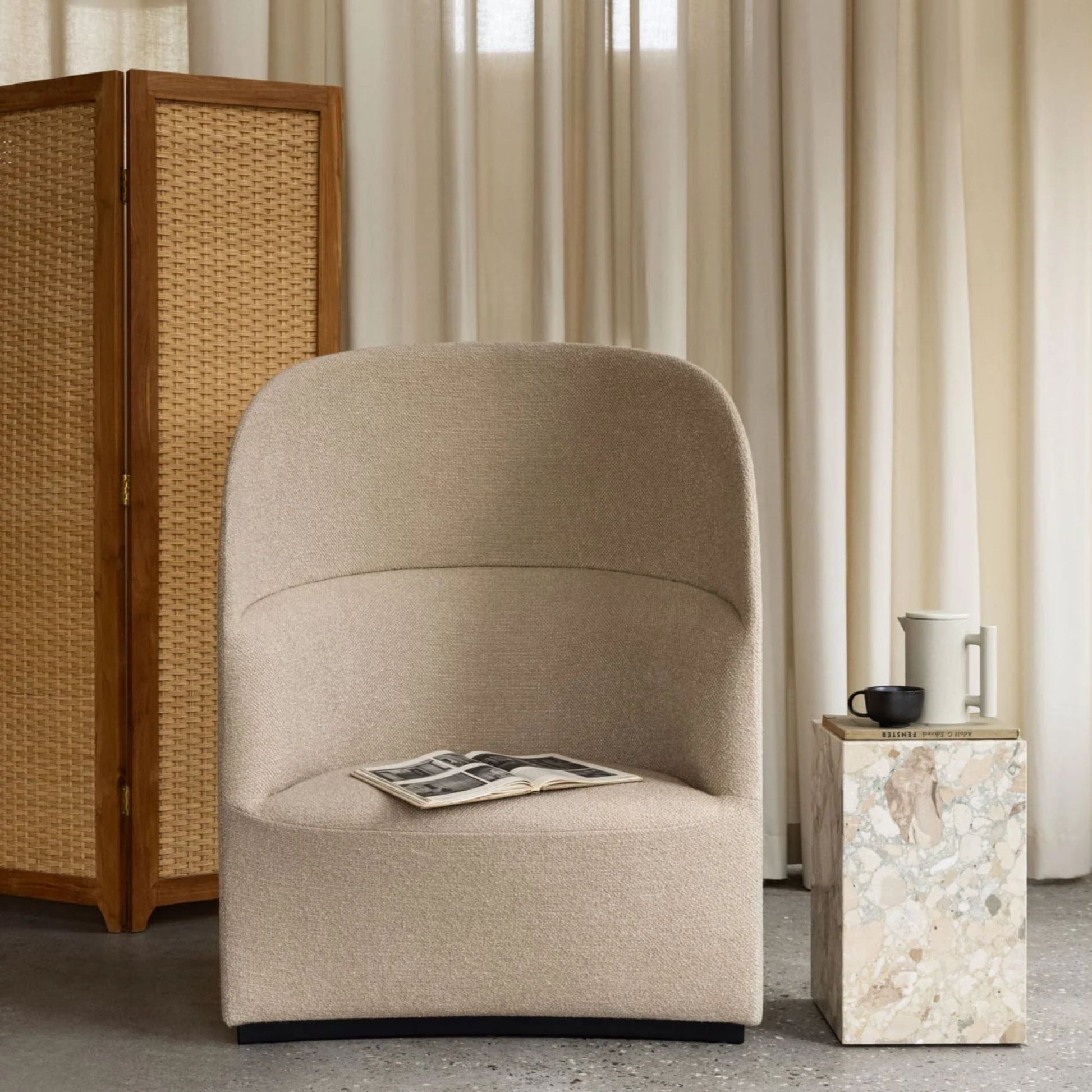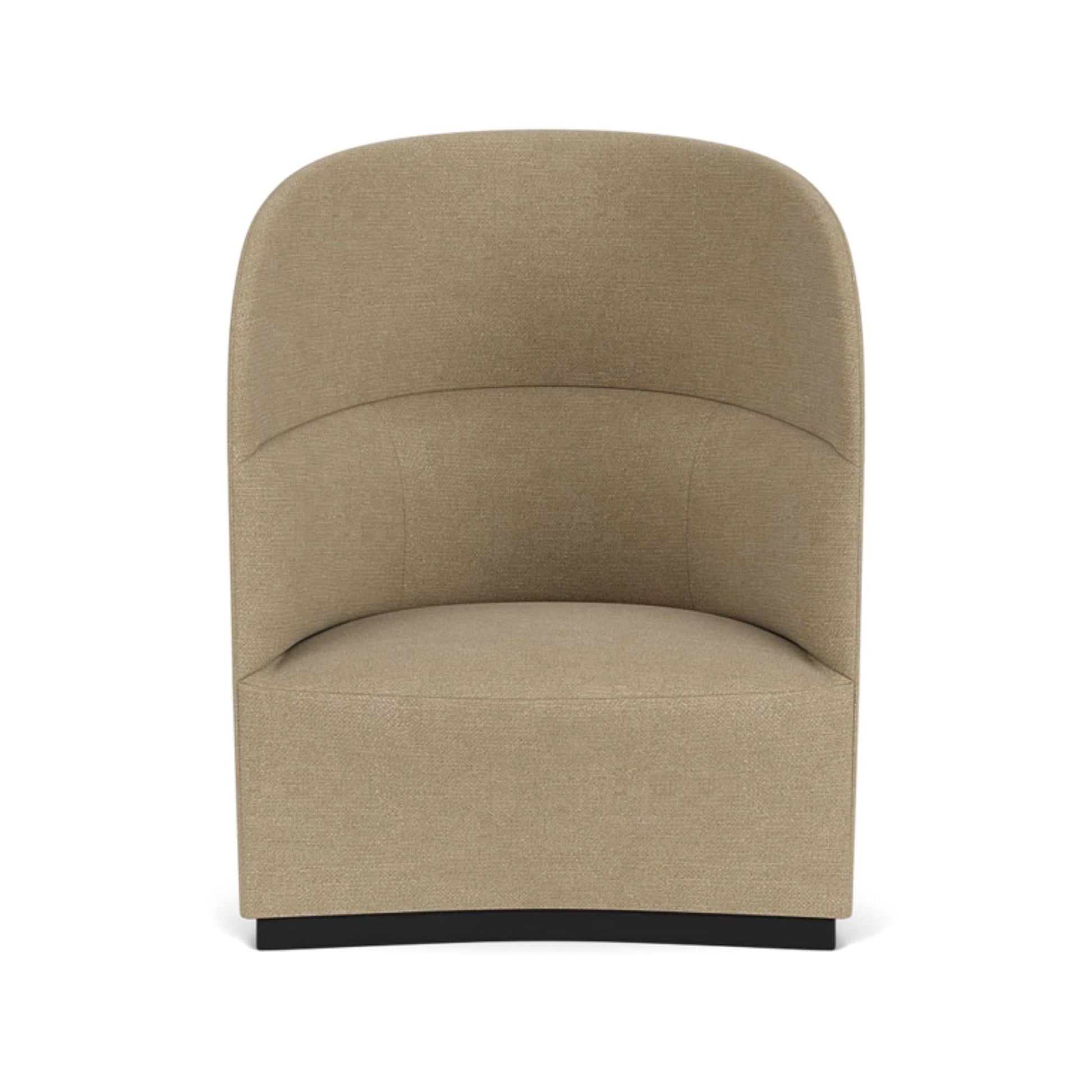 The high back version of the Tearoom Lounge Chair offers moments of quiet contemplation in busy spaces. Expressive and elegant, the secluded, foam-filled furniture piece rests on a wooden base for a natural contrast to the upholstered seat. The addition of a USB port and power socket at the base makes it a practical spot for work as well as play.