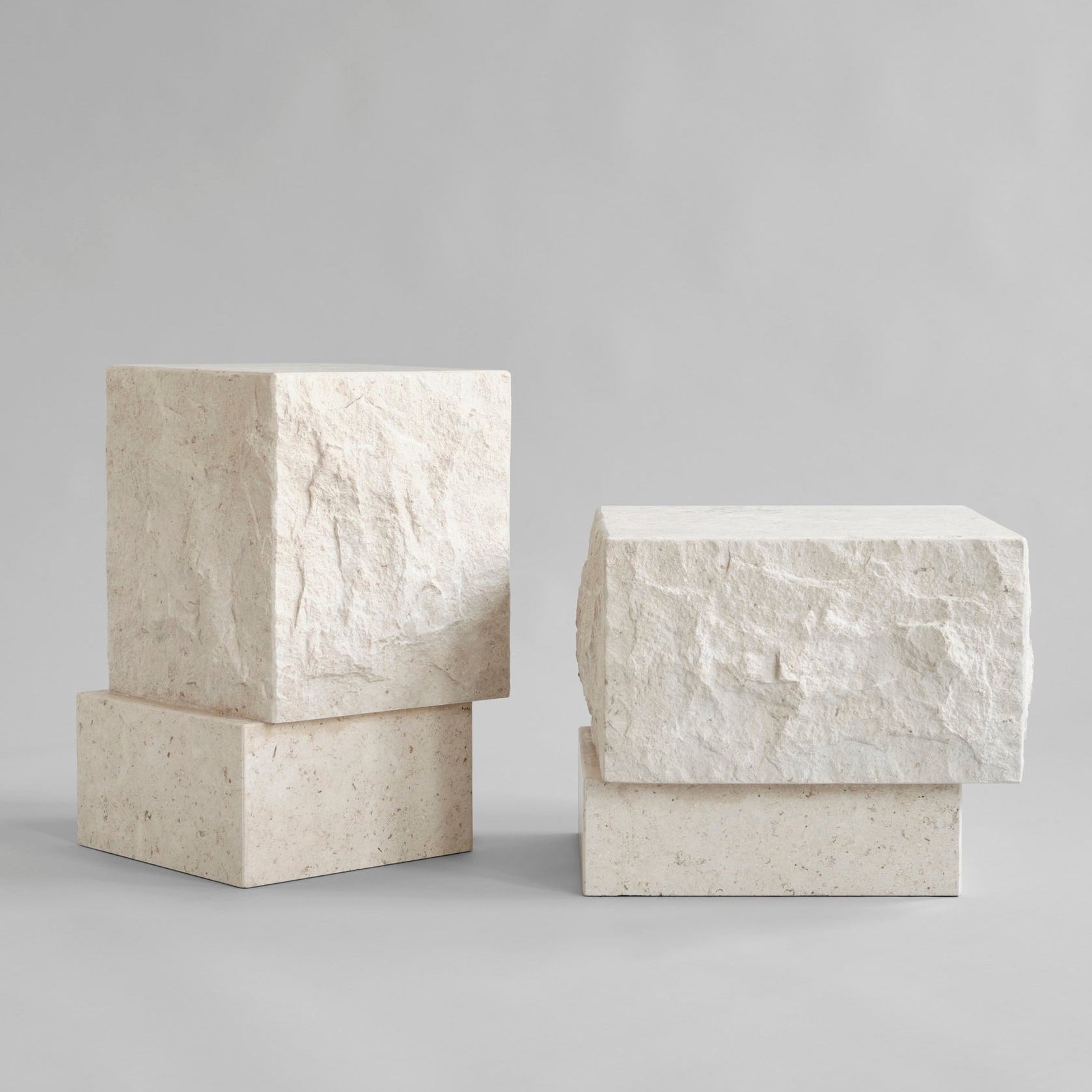 Rich on architectural references, Temple Coffee Tables reminisces architectural facades to create a play of tactile and polished surfaces. Made from a beautiful sand colour limestone, each table consists of two staggered blocks on top of each other. Rich on texture, small holes and incorrections, each table embraces the beauty of the natural stone.
