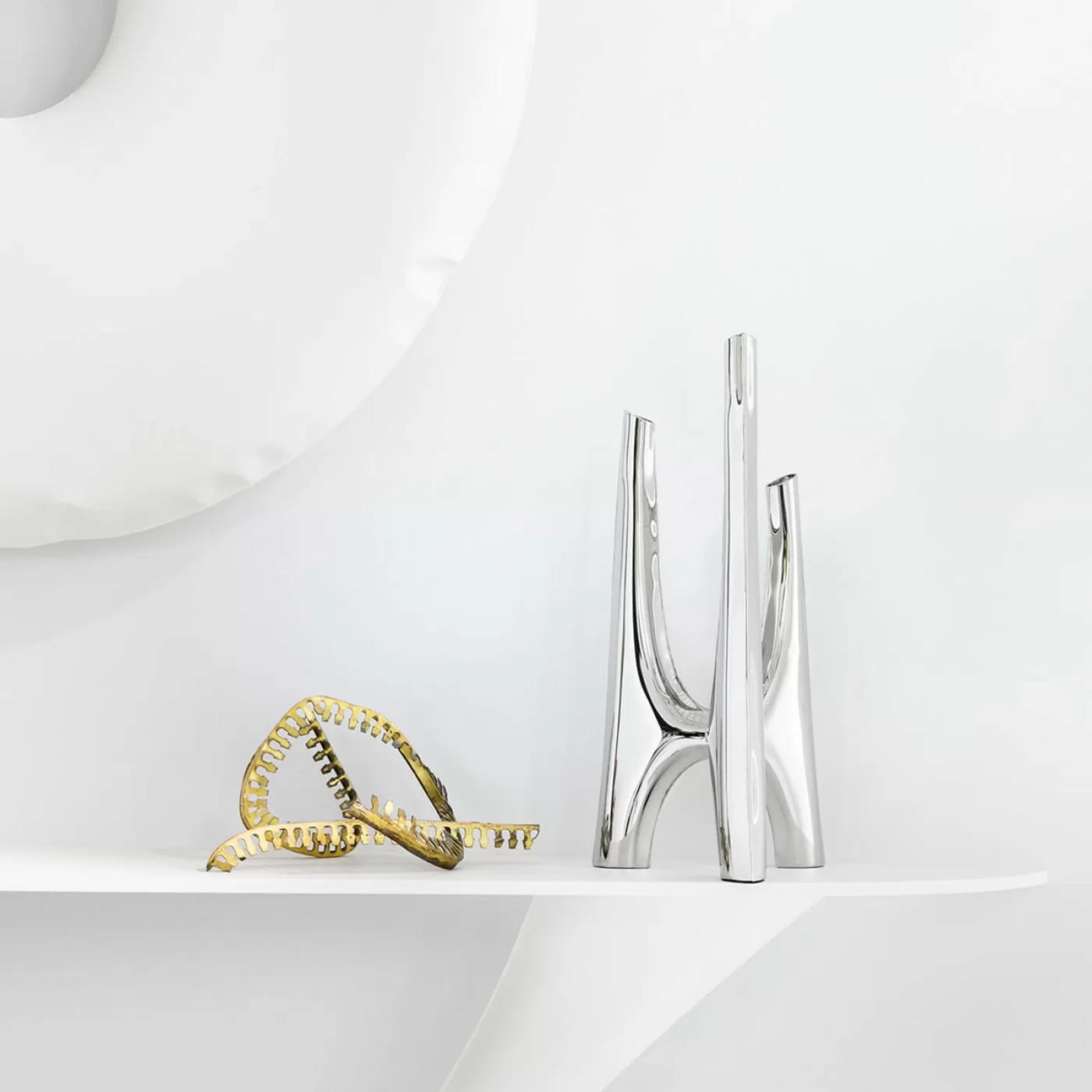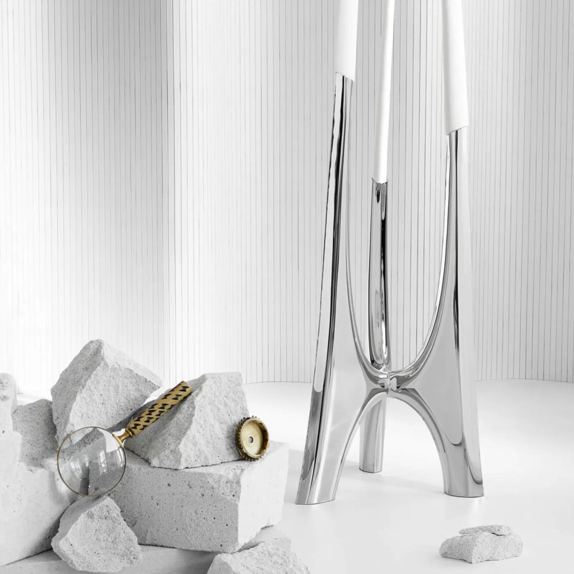 Triglav is a steel candleholder inspired by slender and soaring Gothic vaults. Its three arms of various heights are like modern tower constructions—delicate in their verticality but stable and unyielding. Thanks to its asymmetrical shape, the Triglav candleholder is full of unexpected opportunities. Depending on the point of view, it presents different aspects and reveals many faces.