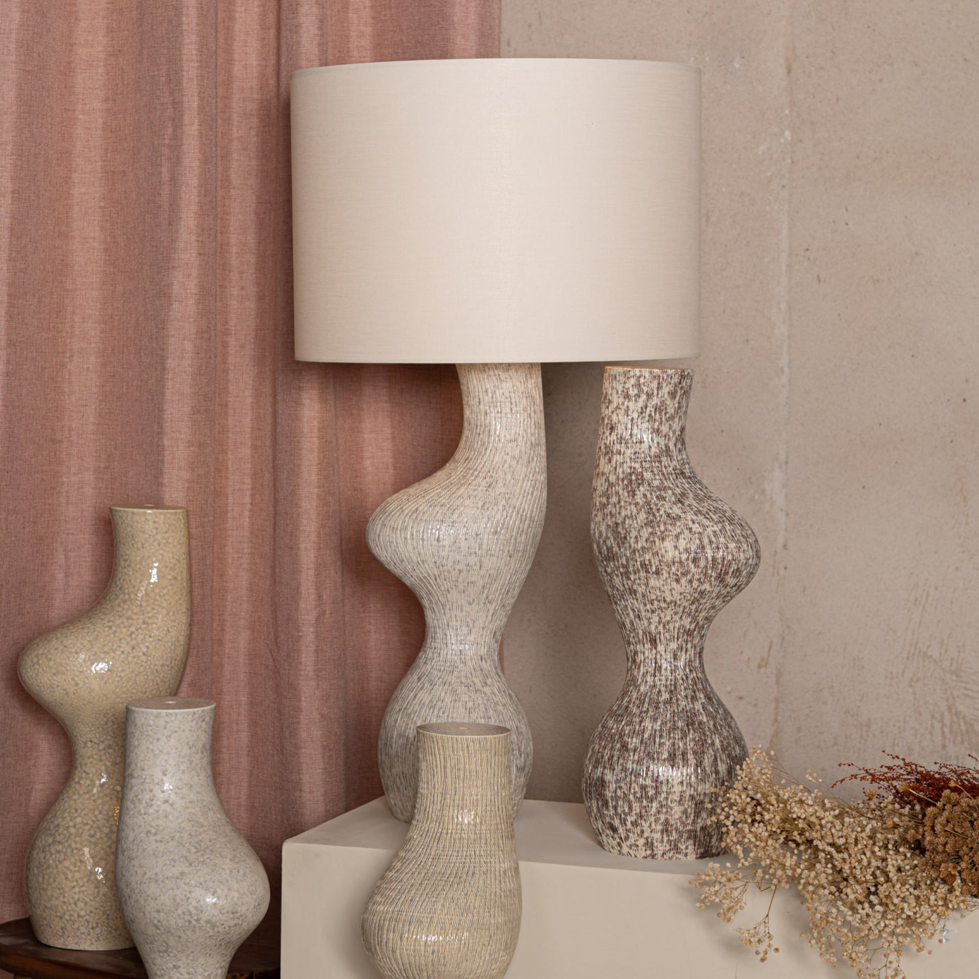 An organic shape enhancing contemporary feminine curves and sublimated by an unique ceramic glaze. Venuso is an impressive piece which can be placed as a table lamp or a floor lamp, difusing a poetic light.