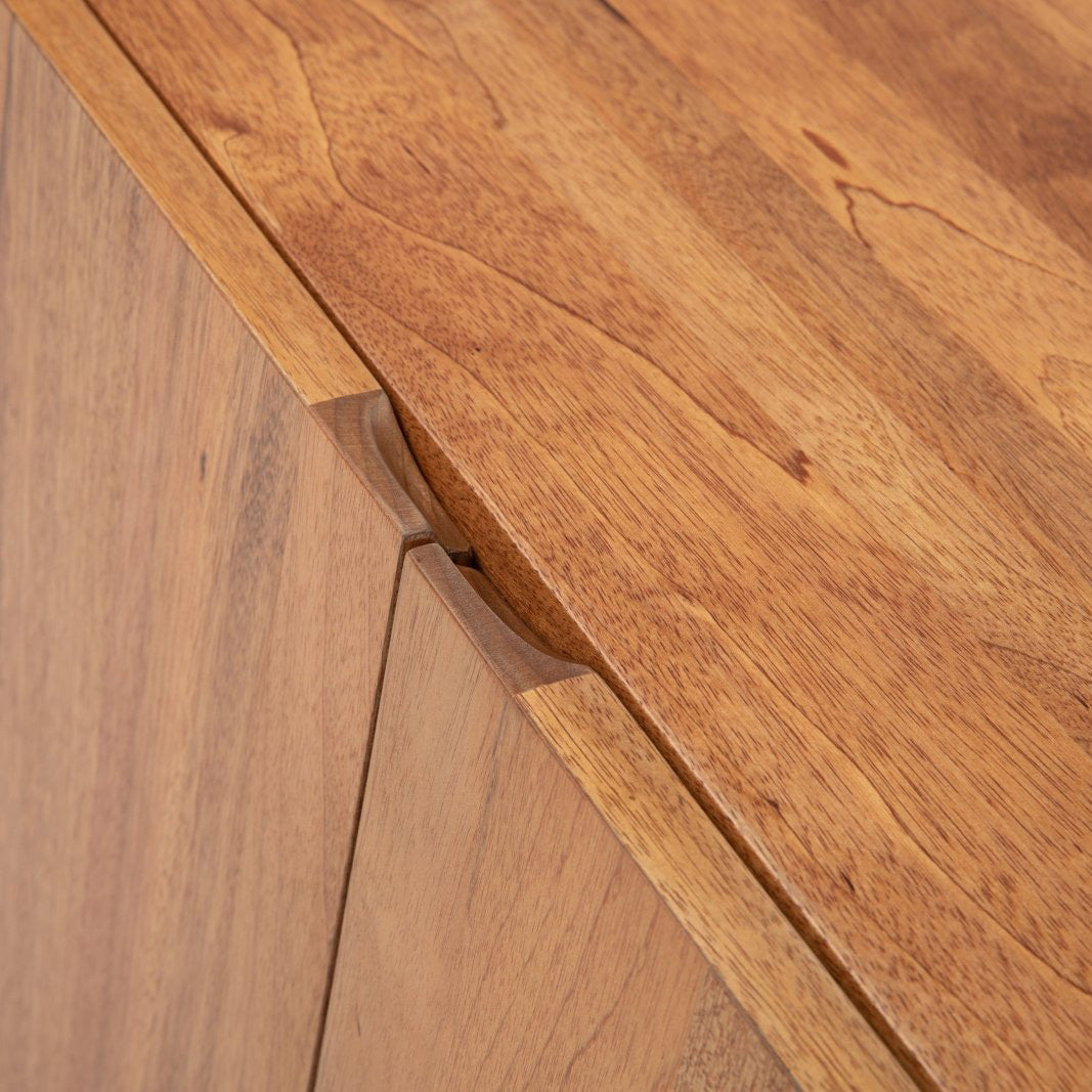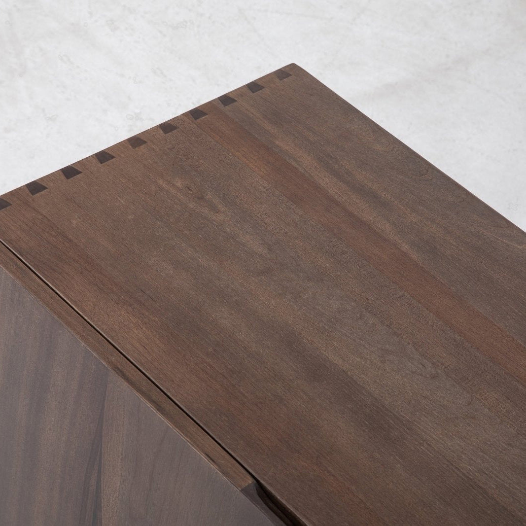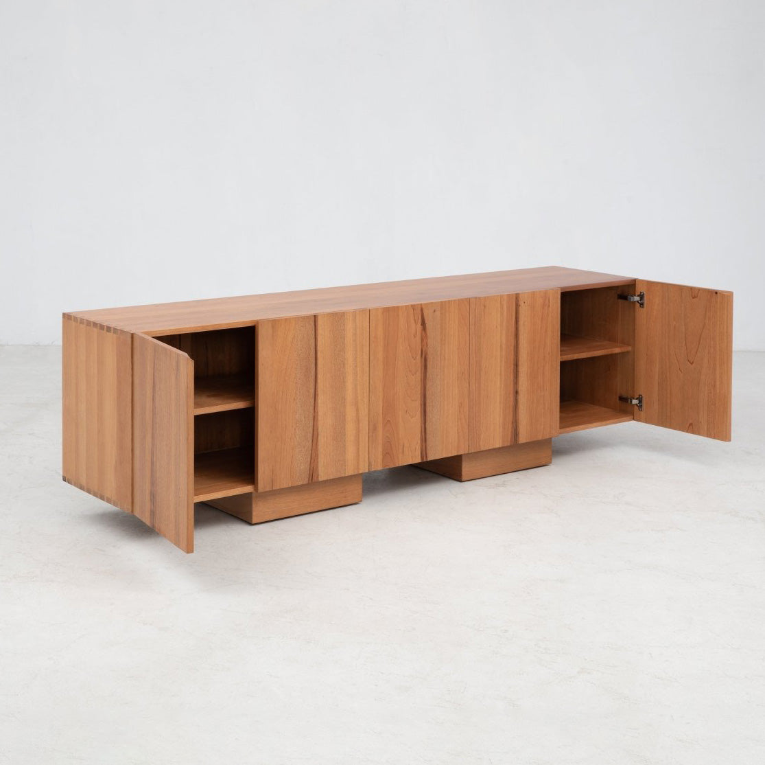 The Wolo Media Cabinet emphasizes the natural characteristics of makata wood with solid front panels that highlight its contrasting grains, color, and a luminescent sheen that changes with the light. There is no veneer here, just solid hardwood panels. The back is fully finished as well, allowing the piece to float in the middle of a room. The whole piece is put together with joinery, which can be seen externally in the finger joints connecting the sides with the top and base. The media cabinet is part of the Wolo series which contrasts heavy columns with thin connections and components for a sculptural look.